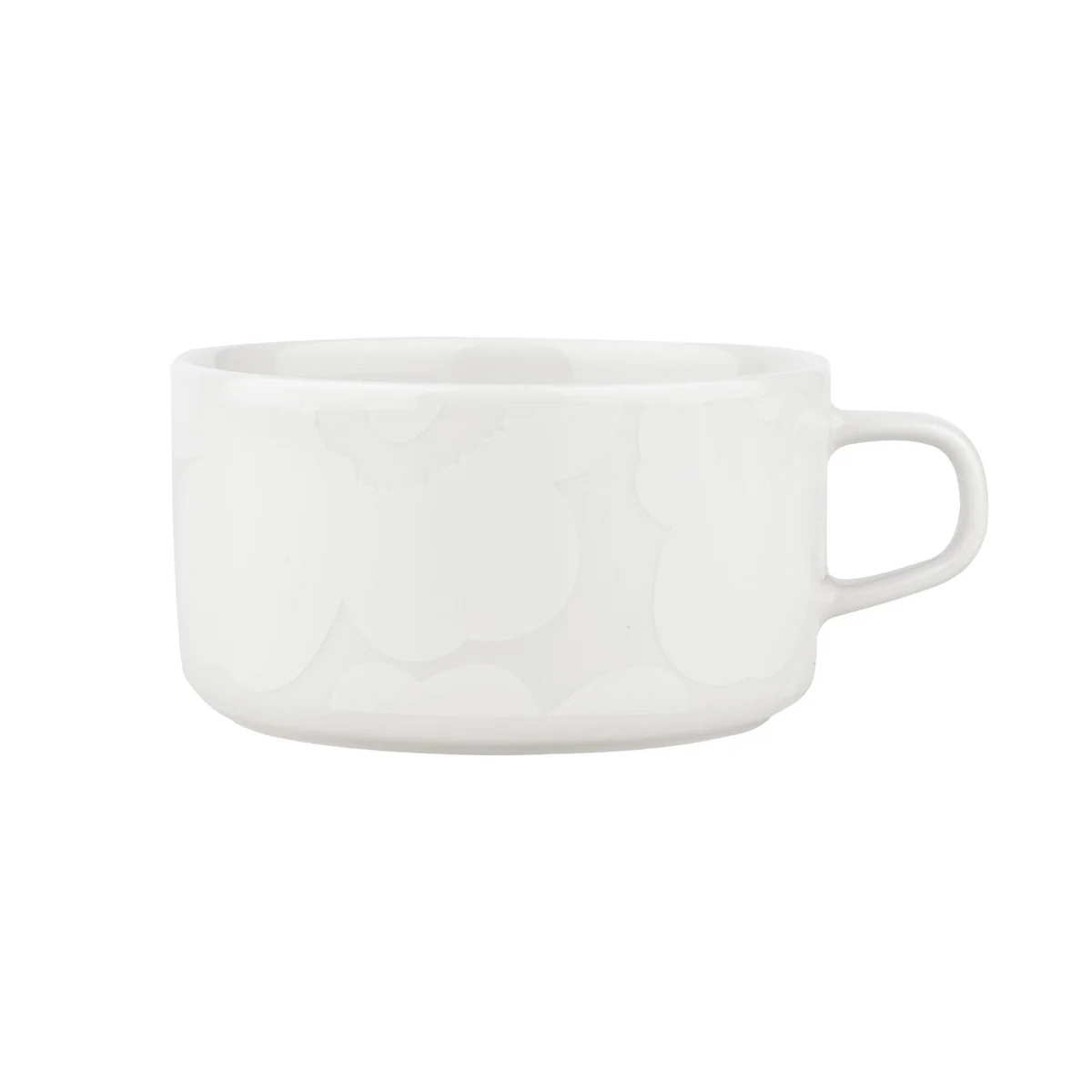 La tasse à thé Oiva Unikko de la maison Marimekko est fabriquée en faïence blanche, elle est durable et convient au lave-vaisselle, au four, au micro-ondes et au congélateur.