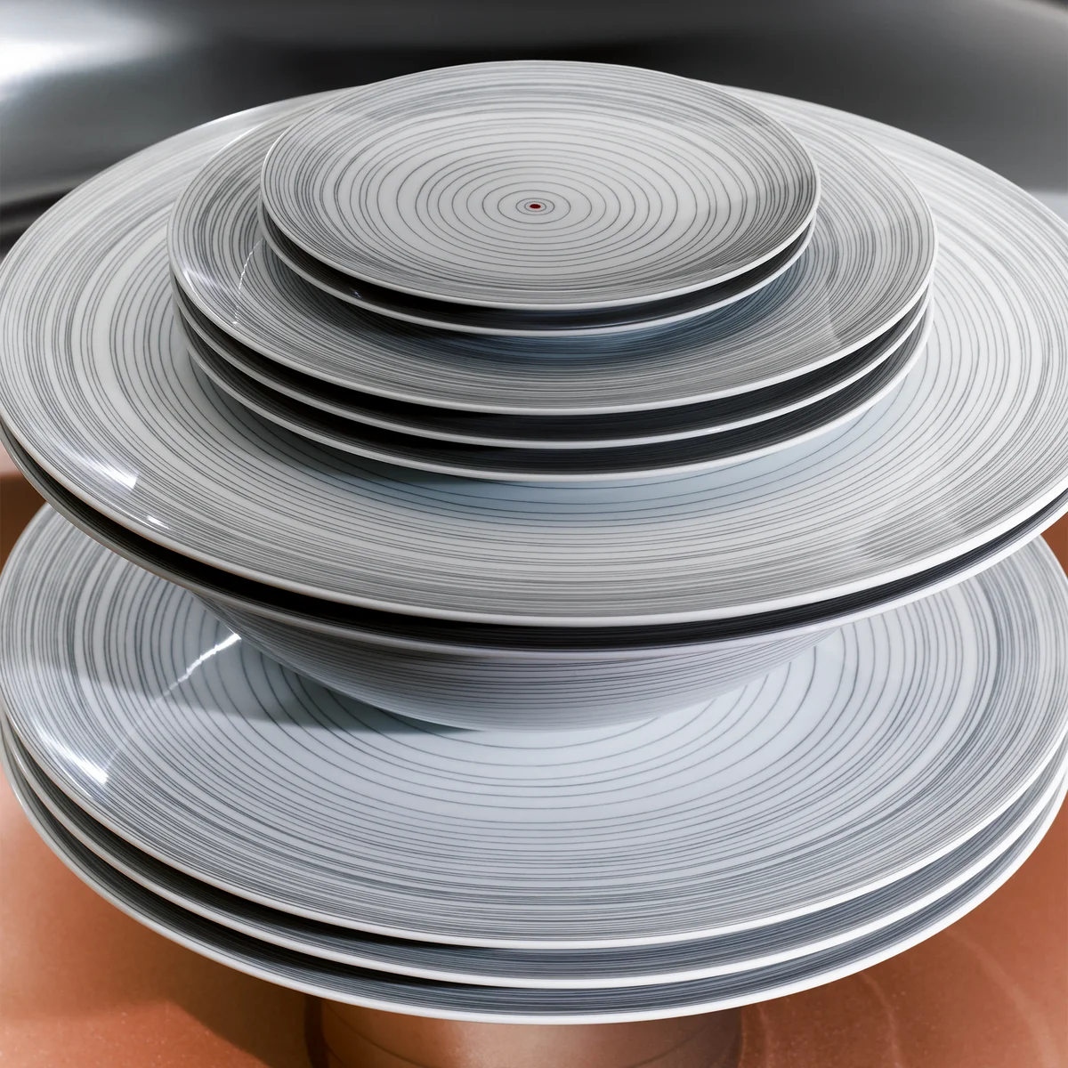 En plus des classiques assiettes blanches, Rosental revisite le décor Stripes, également conçu par Gropius, pour marquer le 100e anniversaire du Bauhaus. Les lignes fines, dessinées à la main, créent un lien entre la forme libre fabriquée à la main et la forme géométrique précise.