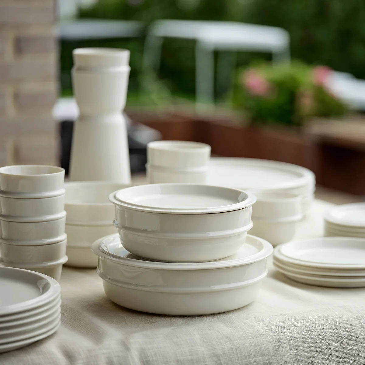 Les Eau assiettes de la maison Zone Denmark . La collection de vaisselle Eau est la version moderne d'un classique intemporel. Son esthétique est délicieusement simple et renonce à tous les éléments inutiles. Le design empilable des tasses, bols et autres facilite non seulement le dressage et le rangement efficaces de la table, mais optimise également l'utilisation de l'espace dans le placard.