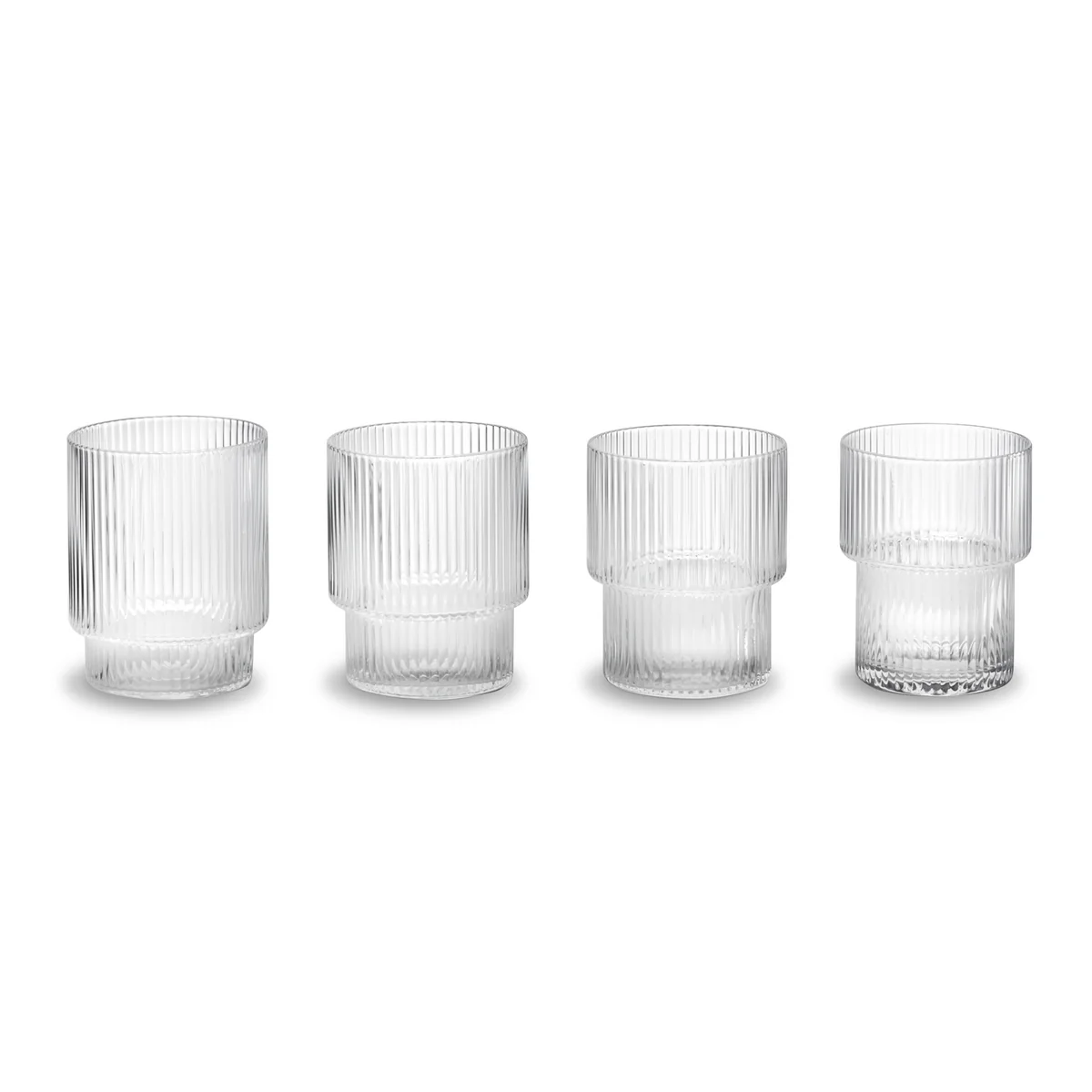 Ce set de quatre verres soufflés à la bouche de la gamme Ripple série de vaisselle de Ferm Living se caractérise par une belle surface cannelée et un aspect individuel, car - chacun des verres du set a une forme différente.