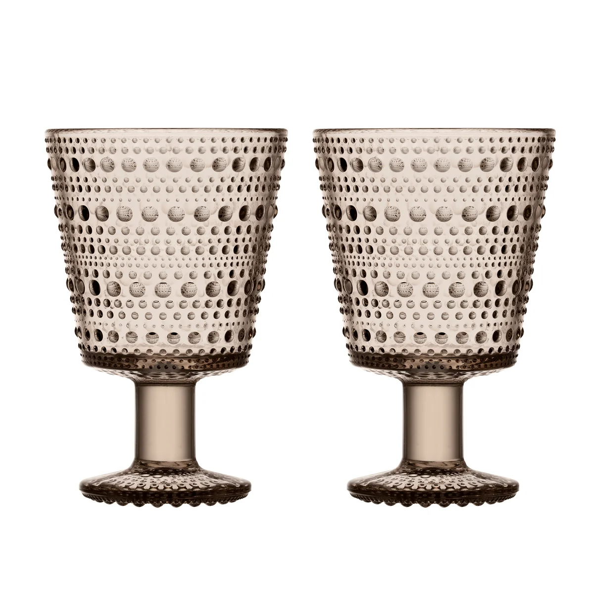 Le Kastehelmi verre à pied d'Iittala séduit par son relief en forme de goutte emblématique, conçu par le designer Oiva Toikka, qui cherchait à l'époque une solution pour dissimuler les joints pressés du verre. Le design de Kastehelmi (qui signifie "goutte de rosée" en finnois) consiste en un relief circulaire de gouttes de verre qui rappellent la rosée scintillant sous le soleil du matin. Sur les verres à pied, le motif attire l'attention sur chaque table de salle à manger. Ils conviennent pour les boissons froides et pour un usage quotidien.