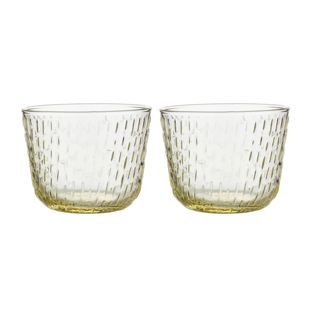 Le Syksy verre à boire de Marimekko est fabriqué en verre soufflé à la bouche. La série Syksy (Automne) série de verres, conçue par Matti Klenell, poursuit l'exploration de la nature et des phénomènes météorologiques, familiers dans l'art de l'impression de Marimekko . Le thème général de la nouvelle série est celui des formes de la pluie d'automne, d'un doux bruissement à des averses puissantes et pénétrantes.