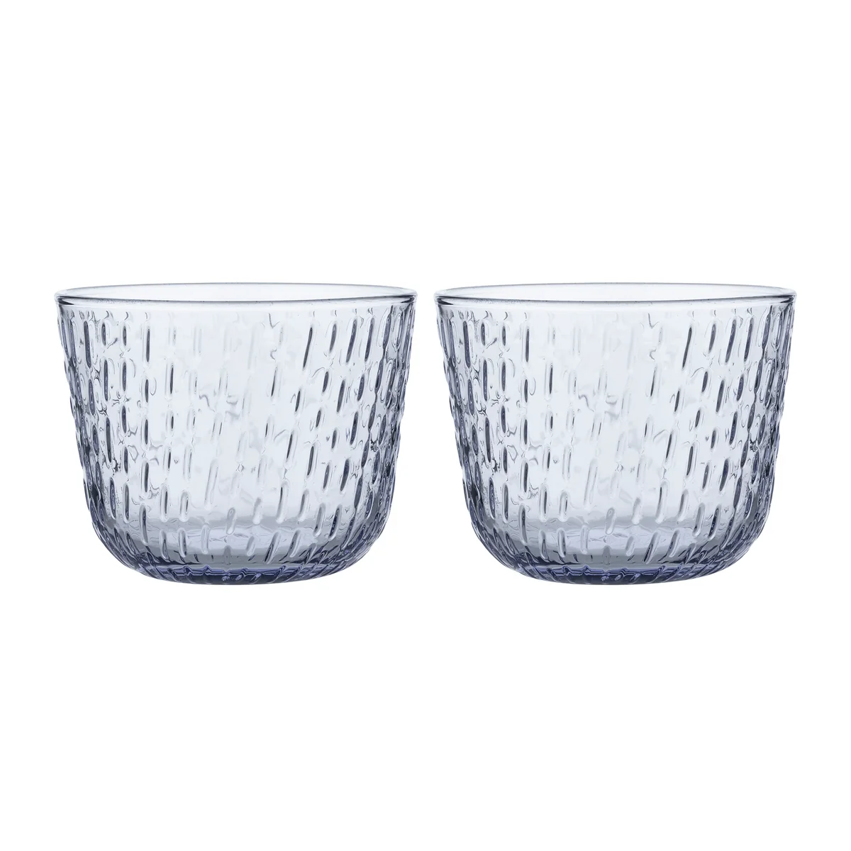 Le Syksy verre à boire de Marimekko est fabriqué en verre soufflé à la bouche. La série Syksy (Automne) série de verres, conçue par Matti Klenell, poursuit l'exploration de la nature et des phénomènes météorologiques, familiers dans l'art de l'impression de Marimekko . Le thème général de la nouvelle série est celui des formes de la pluie d'automne, d'un doux bruissement à des averses puissantes et pénétrantes.