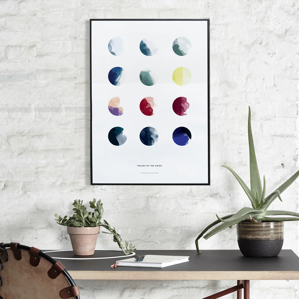 Le poster « Moon Phases » est une création du studio de design et de graphisme scandinave All way to Paris. Le studio de design est connu pour ses graphiques puissants ainsi que ses détails délicats et élégants. Cette impression illustre les différentes phases et visages de la lune à travers de jolies peintures à l'aquarelle. Les couleurs sont classées selon les saisons : du froid et glacial mois de janvier au rouge de la lune d'été, la lune a toujours un visage unique.