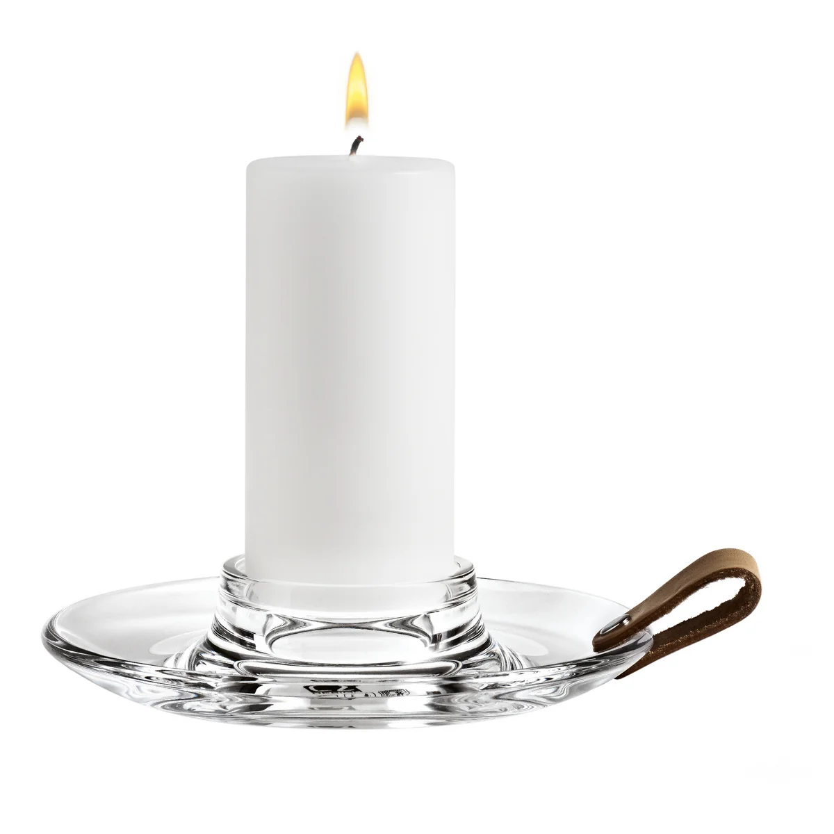 Le bougeoir en verre avec sa boucle en cuir caractéristique fait partie de la série populaire "Design with Light" de Holmegaard . La designer Maria Berntsen a créé pour cette série des objets en verre particuliers qui, avec des bougies, créent une ambiance chaleureuse.