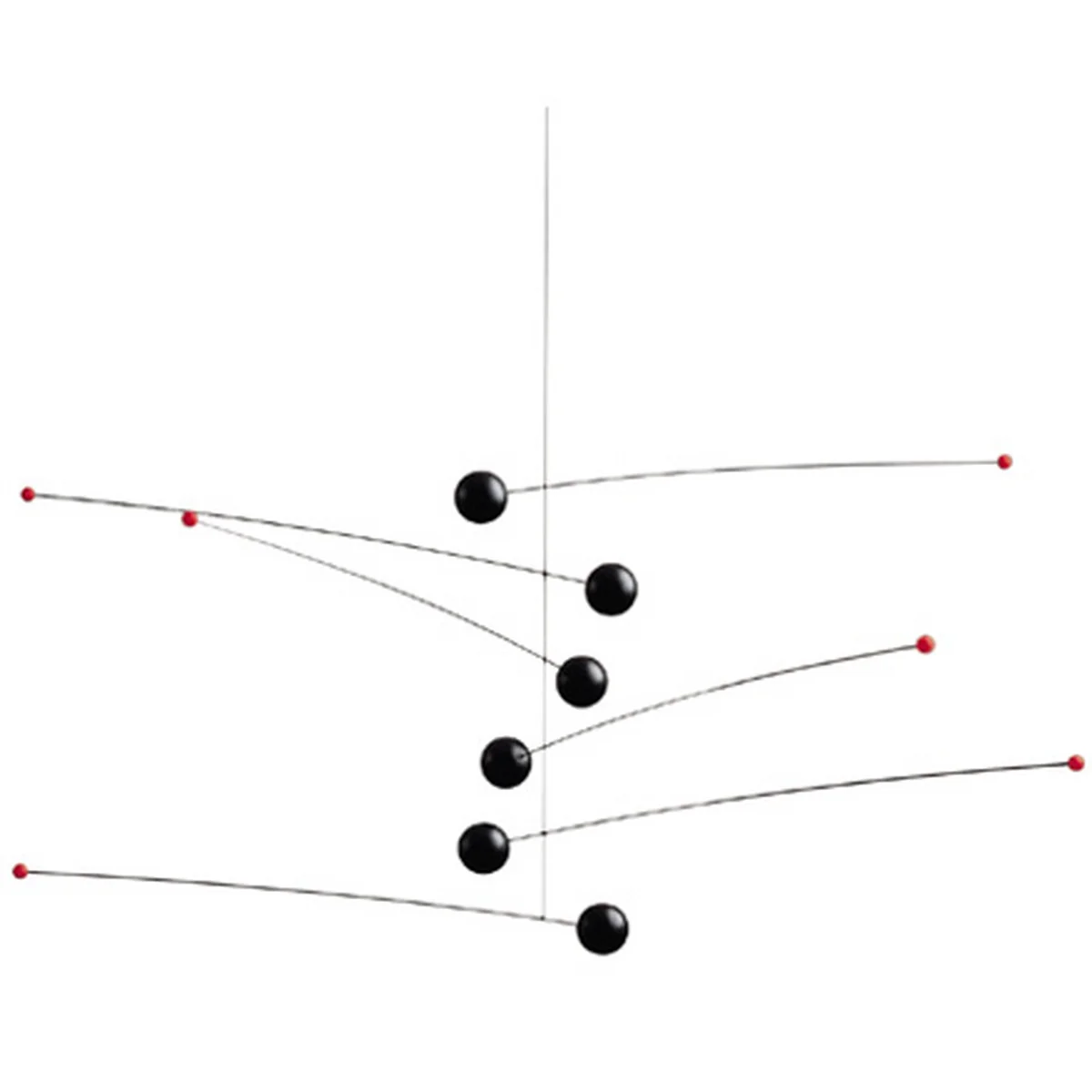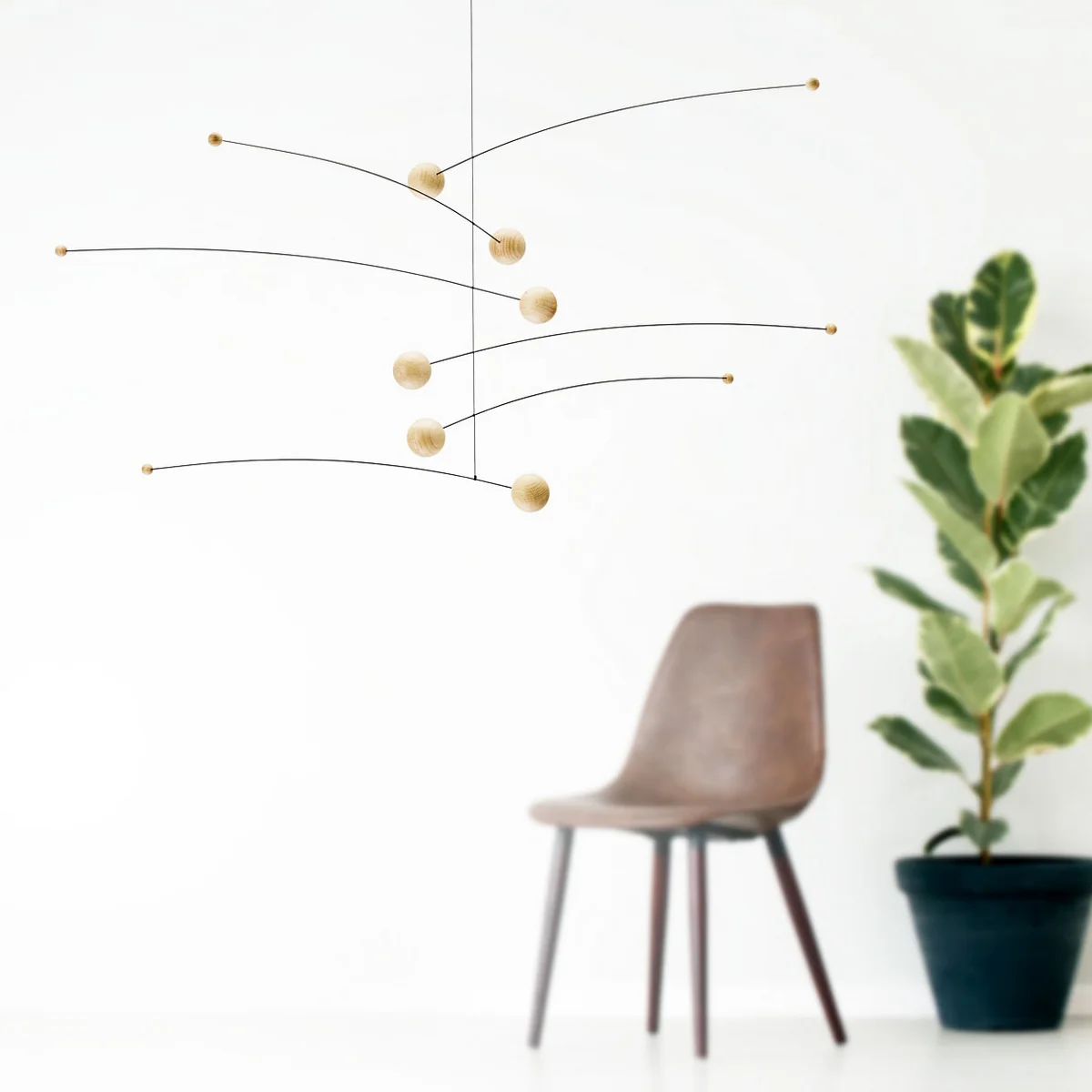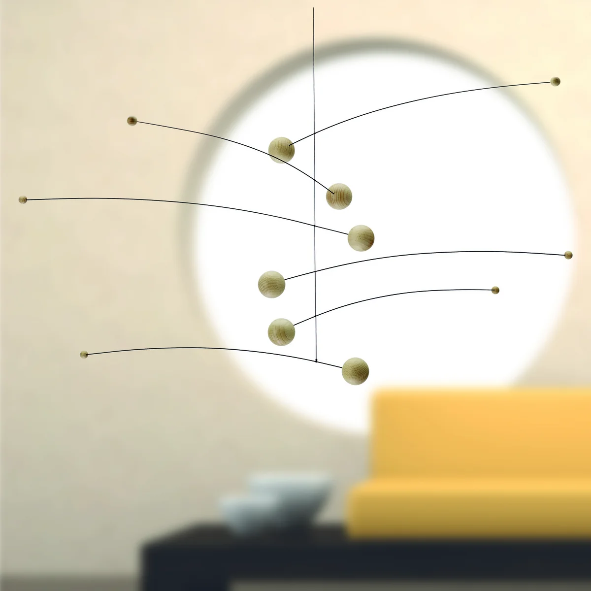 Le mobile laisse libre cours à l'interprétation : Six planètes avec leurs lunes Ou un symbole des côtés clairs ou sombres de la vie