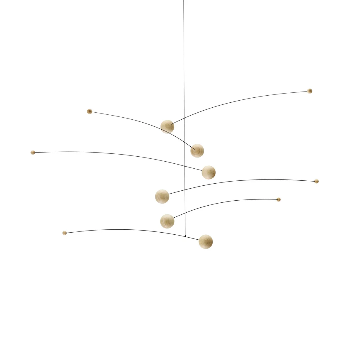 Futura de Flensted Mobiles propose également un jeu avec les matériaux. Il se compose d'acier, de billes en bois de hêtre et de billes en plastique.