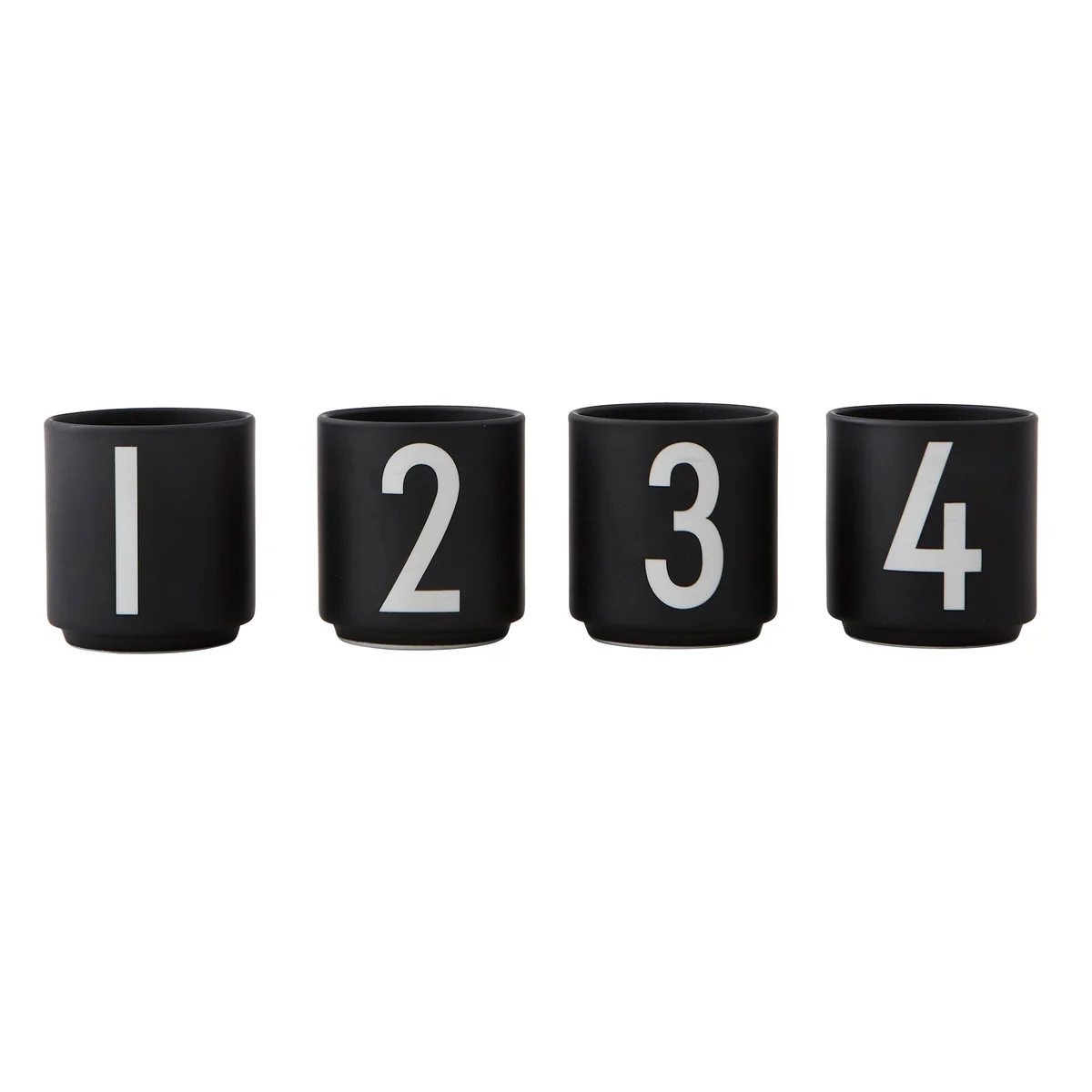 Les chiffres frappants qui ornent les tasses ont été conçus par le designer danois Arne Jacobsen en 1937. Initialement destinés au lettrage interne de l'hôtel de ville d'Aarhus, les lettres, chiffres et caractères ornent aujourd'hui divers textiles de maison, articles de table et ustensiles de bureau de Design Letters . Un design moderne et ludique pour les acrobates des mots, les amateurs de graphisme et de design.