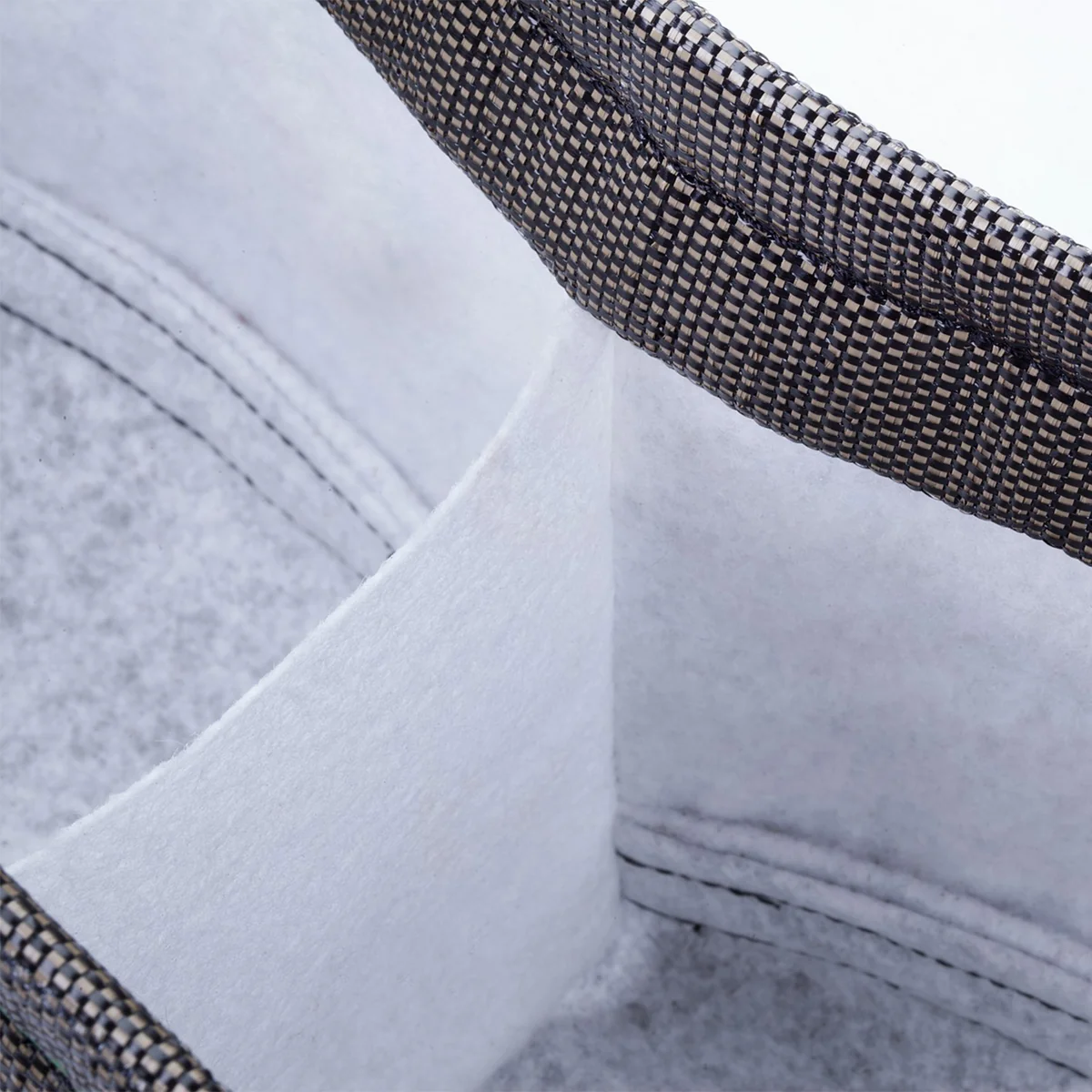 Le tissu géotextile est non seulement relativement léger, mais il offre également à la plante et à son milieu des conditions de croissance idéales : il permet à la terre de respirer, est perméable à l'eau et limite en même temps l'évaporation. Batyline, en revanche, est un tissu à double paroi qui maintient l'équilibre nécessaire entre l'air, le sol et l'eau. Le tissu extérieur, résistant à la déchirure, à l'abrasion et au gel, est traité aux UV et peut supporter des températures de -30°C à 70°C. A l'intérieur, la couche de feutre protège les racines, limite l'évaporation et répartit l'eau. De plus, le tissu est perméable, ce qui permet à la terre de respirer et à l'eau de s'écouler. Tout comme le géotextile, il est recyclable à 100 %.