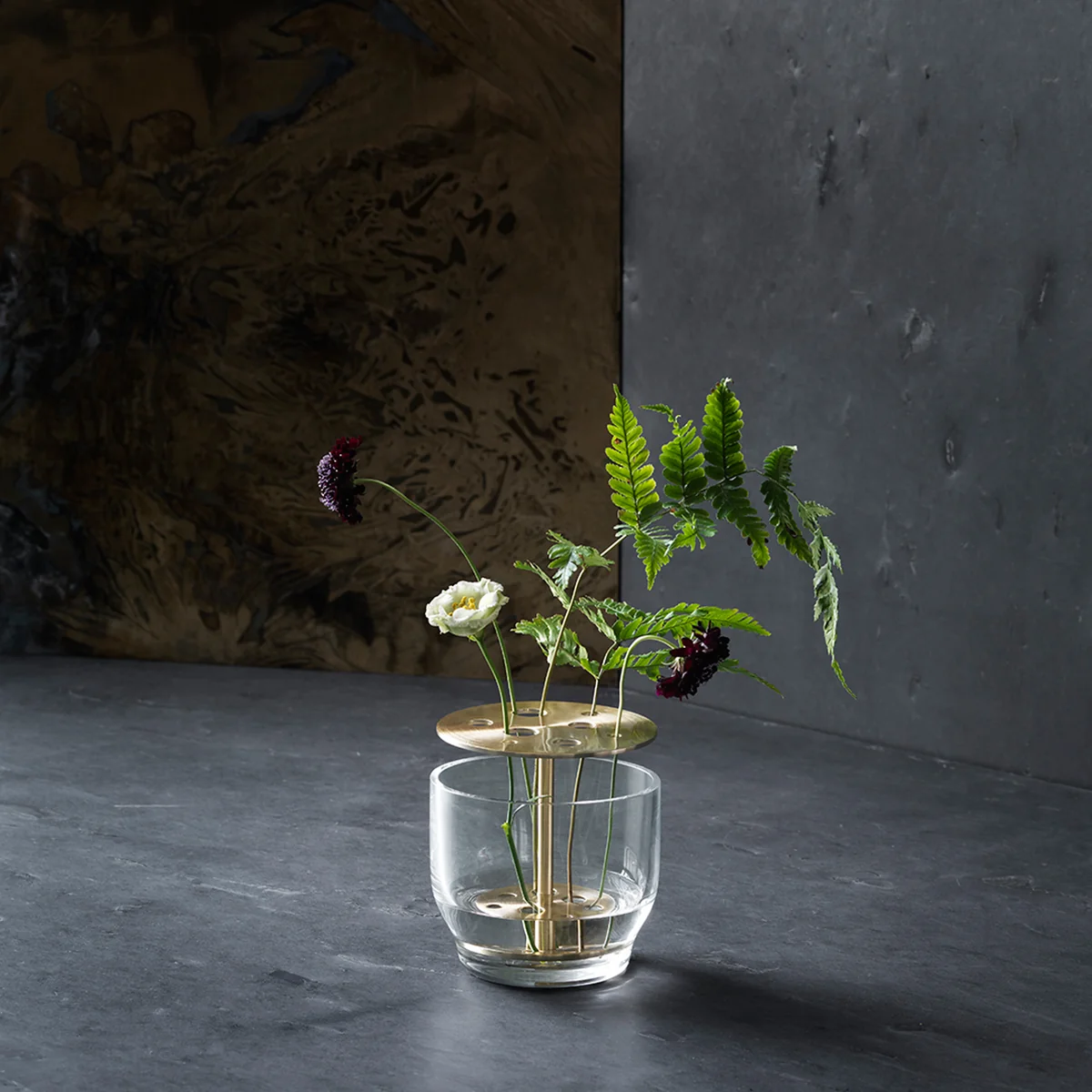 La plaque perforée en laiton massif ou en acier inoxydable qui complète le récipient en verre permet d'assembler des fleurs de style, des arbustes ou des herbes pour former une composition florale.
