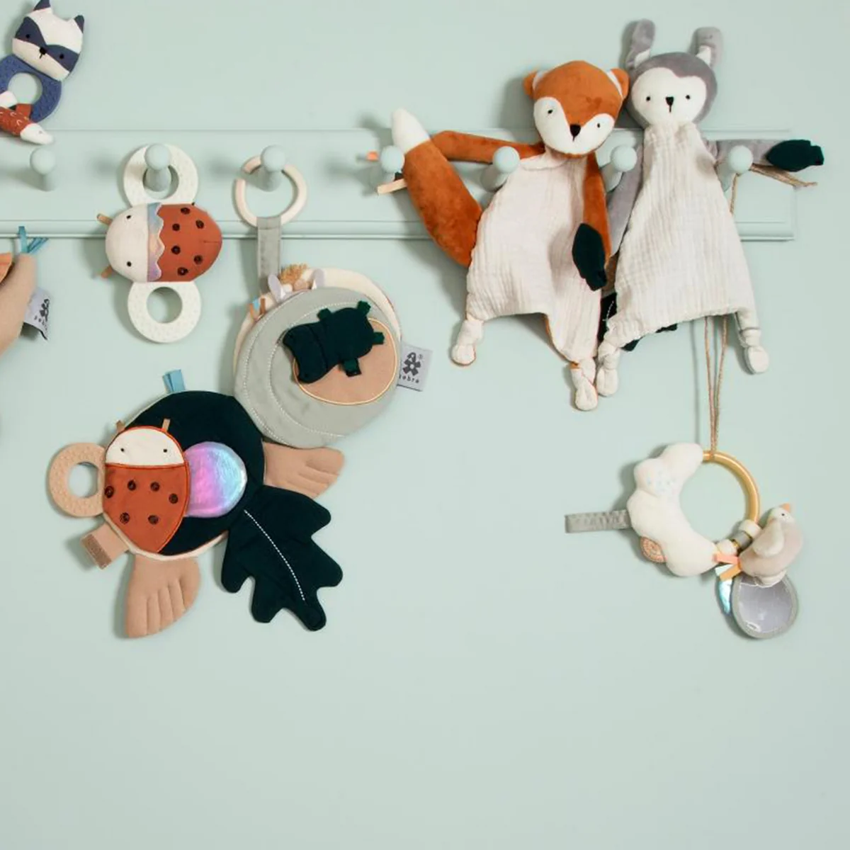 Les doudous disposent d'un anneau de dentition en silicone qui apaise et stimule les petits chéris lorsque leurs gencives les démangent, notamment lors de la poussée dentaire. Grâce à la fermeture velcro, une tétine peut être fixée au doudou, de sorte que le doudou abrite tout ce qui est nécessaire au quotidien.