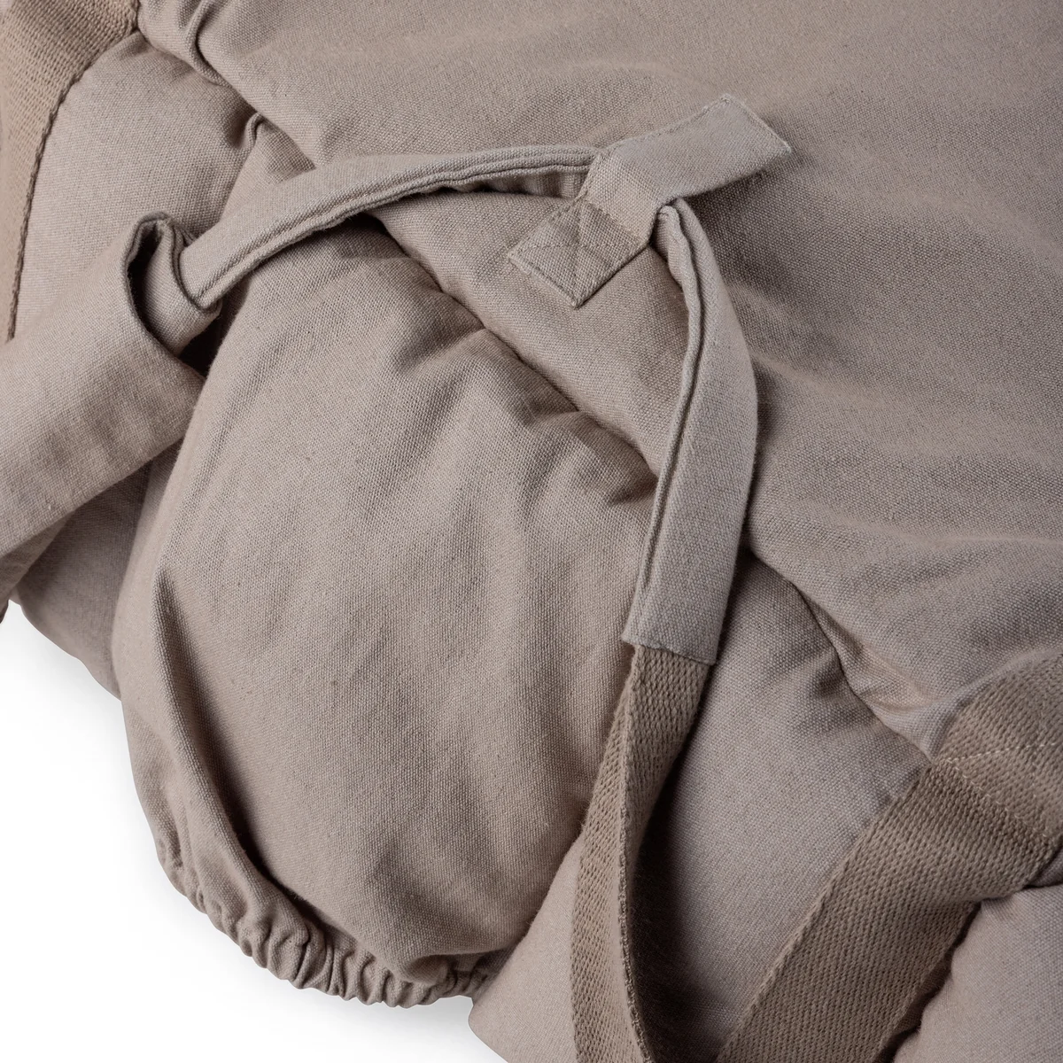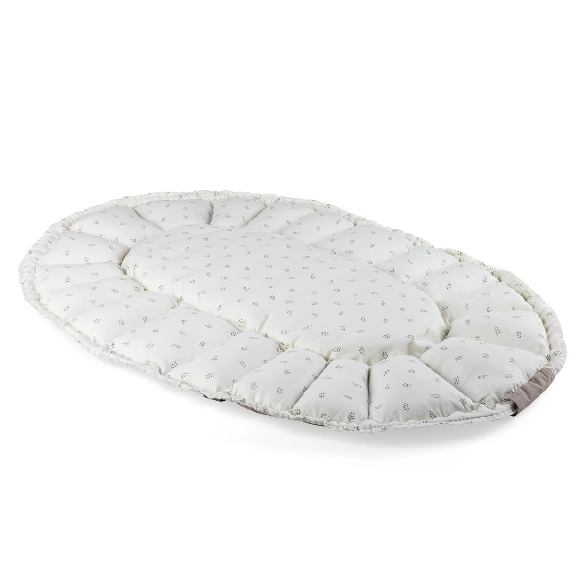 Le tissu extérieur est en beige jetty, tandis que l'intérieur présente un joli imprimé de feuilles unisexe sur un fond beige clair. Grâce à une fermeture éclair YKK, le matelas en kapok et la plaque de fond peuvent être retirés et la housse ainsi que le matelas peuvent être lavés séparément à 40 °C. Le kapok doit être séché au sèche-linge.