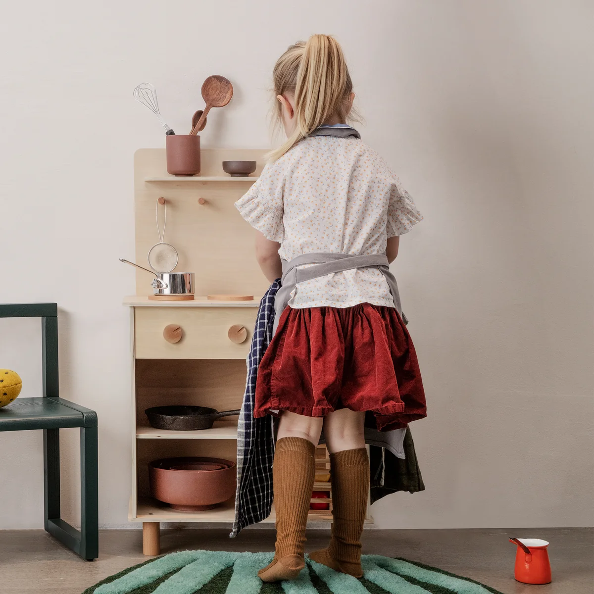 Fabriquée en contreplaqué, la cuisine est d'une robustesse exceptionnelle et est donc idéale pour une utilisation dans la chambre des enfants. La cuisine a un évier avec robinet, deux plaques de cuisson, trois crochets et des étagères pour le rangement. Les petits détails sont en hêtre massif et se distinguent légèrement des façades par leur couleur. La cuisine peut être équipée avec la vaisselle pour enfants de Ferm Living.