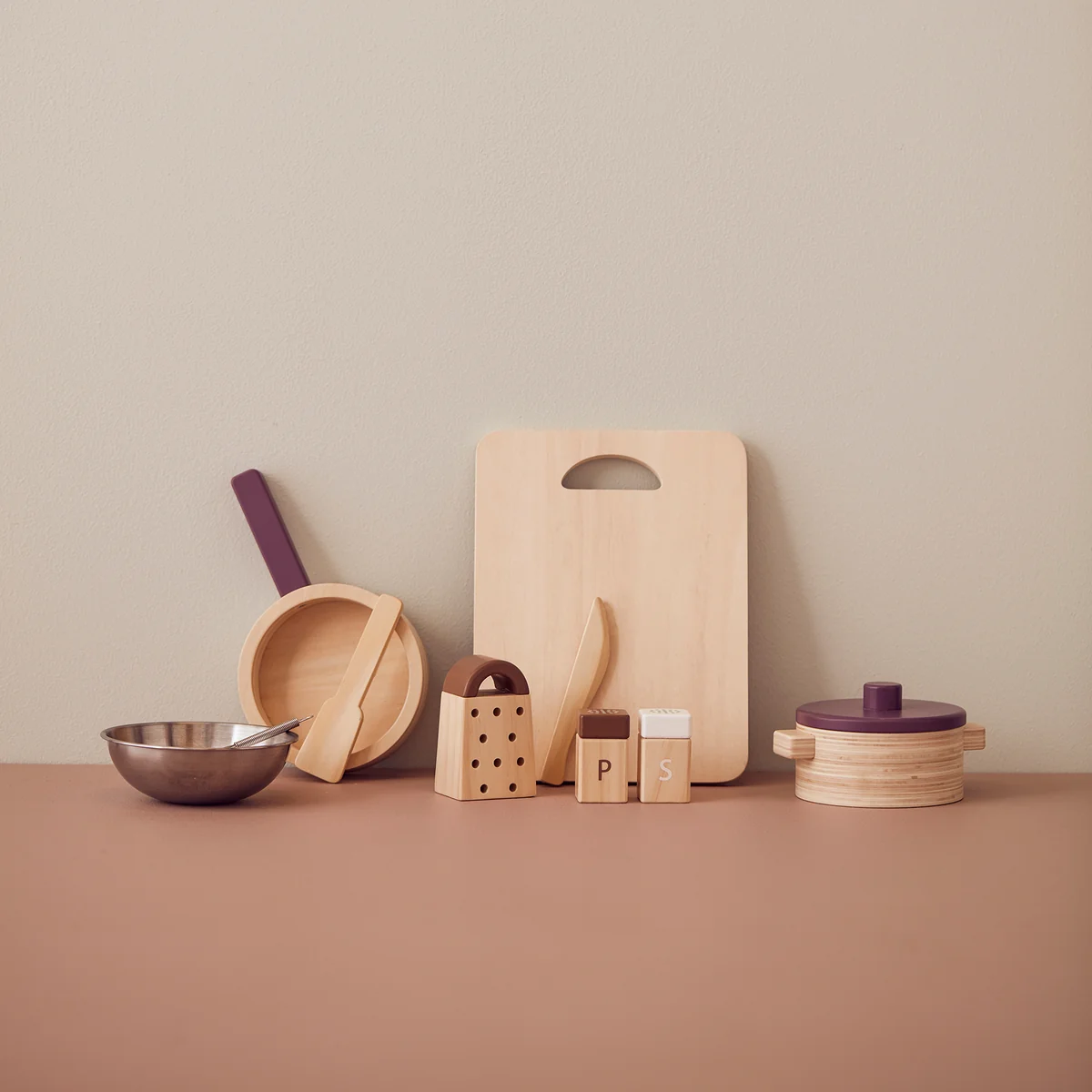 Le set d'ustensiles de cuisine Bistro de Kids Concept a été conçu pour cuisiner avec fantaisie sur des réchauds de jeu. Cet ensemble complet comprend une casserole, une poêle, un bol en métal avec un fouet, une râpe, des récipients pour le poivre et le sel, une planche à découper et un couteau. L'ensemble constitue un complément fantastique pour toute cuisine de jeu en bois, garantissant des heures de plaisir et offrant des possibilités illimitées de jeu créatif. Le set de vaisselle sert de catalyseur pour des jeux de rôle imaginatifs et inventifs. Les couteaux et la planche à découper sont d'ailleurs exempts de vernis et peuvent être traités avec de l'huile de qualité alimentaire pour plus de sécurité.