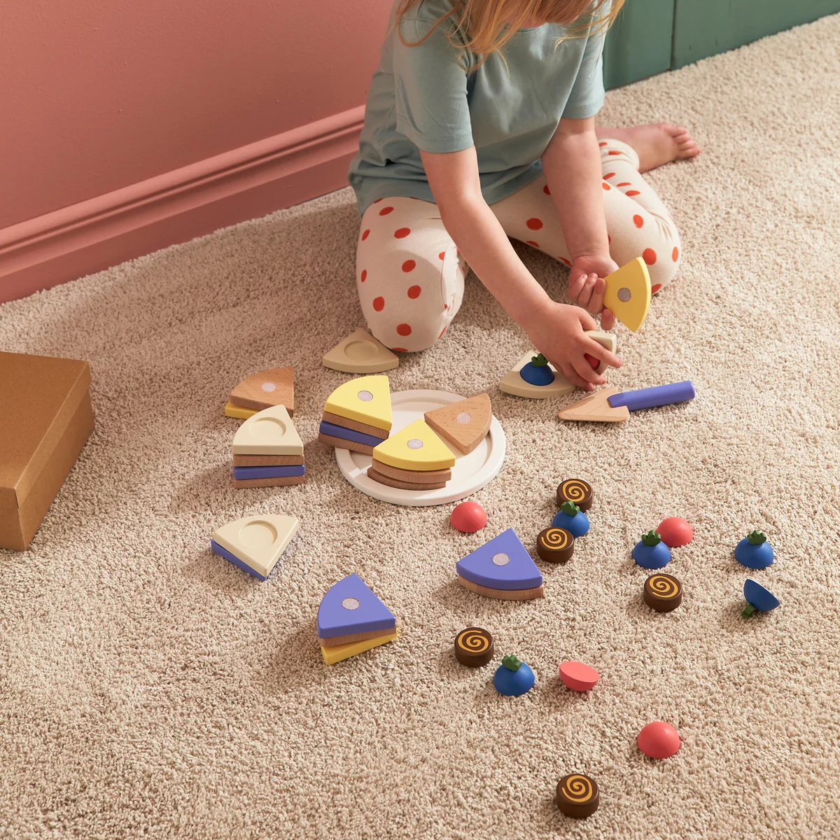 Grâce à la boîte en carton pratique, le transport de la pâtisserie pendant la période de jeu devient un jeu d'enfant. Après avoir dégusté ce gâteau jouet en bois, une véritable recette peut être trouvée sous l'onglet "Matériel supplémentaire" pour satisfaire les envies sucrées. Le set comprend un présentoir à gâteau, vingt-cinq fonds de tarte différents, cinq myrtilles, cinq pépites de chocolat, cinq oursons en gomme, une spatule à gâteau et une boîte à gâteau.