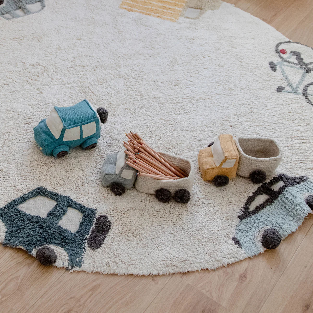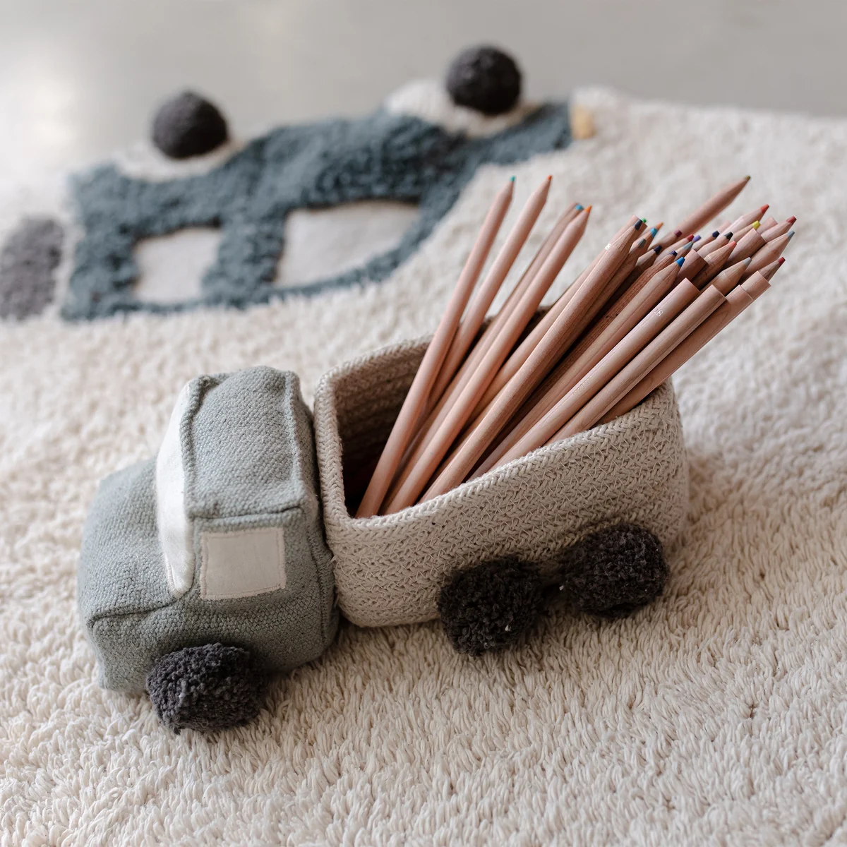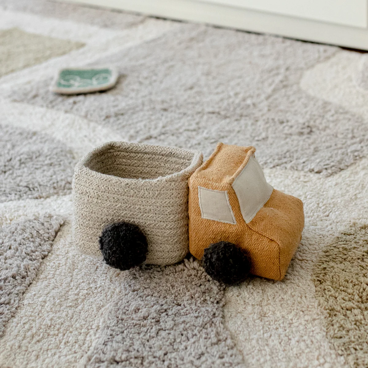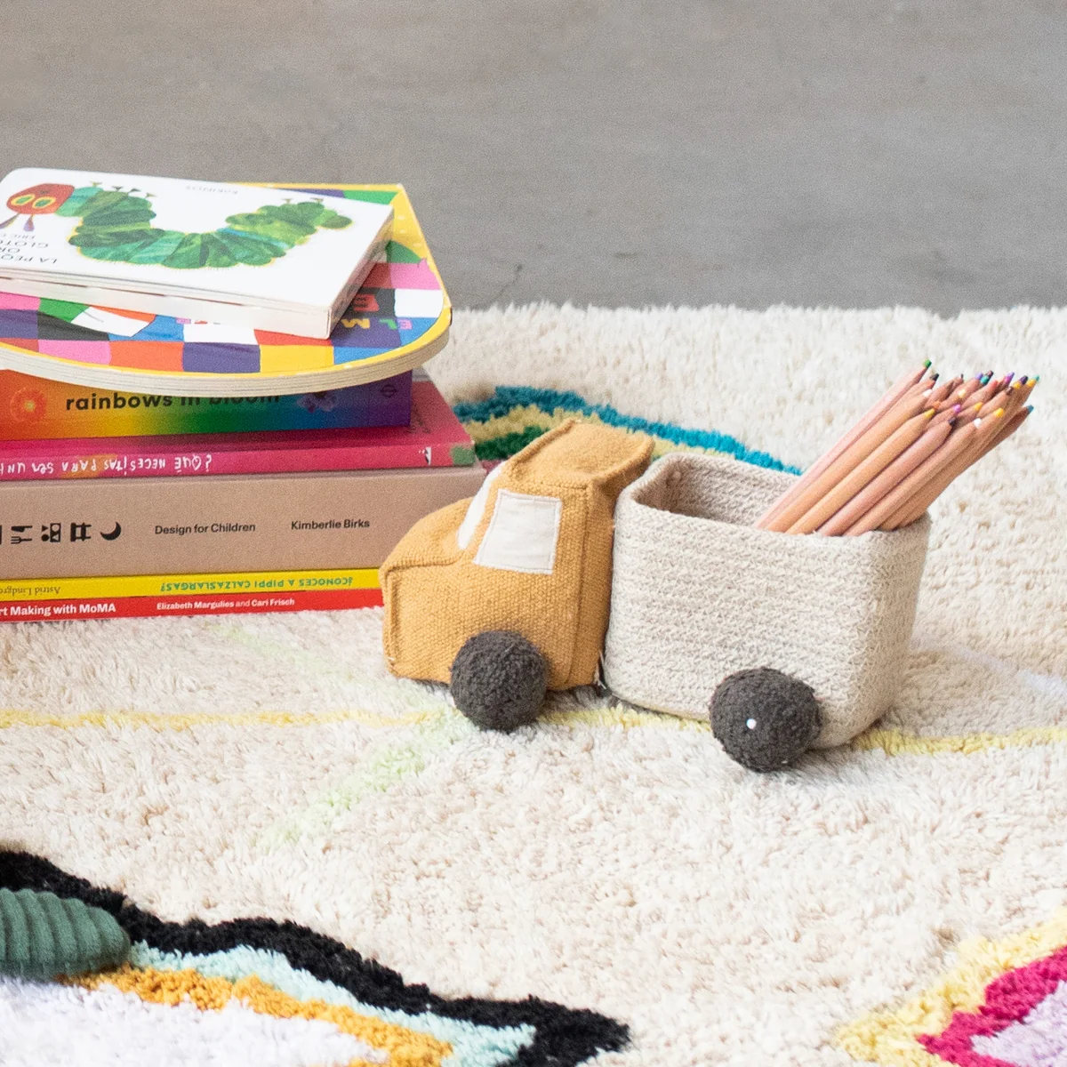 Le camion jouet de la maison Lorena Canals offre dans ses paniers pick-up un espace idéal pour les petits jouets. Billes, perles, crayons de couleur et autres peuvent être utilisés de manière idéale pour le rangement et le transport. Les adorables pompons représentent les roues du camion pick-up. La plaque d'immatriculation du camion apporte une touche de raffinement avec l'inscription "L0 R3 NA". Le camion jouet est fabriqué en coton et en polyester et est disponible en set de 2 pièces. Ainsi, le rangement devient directement plus amusant !