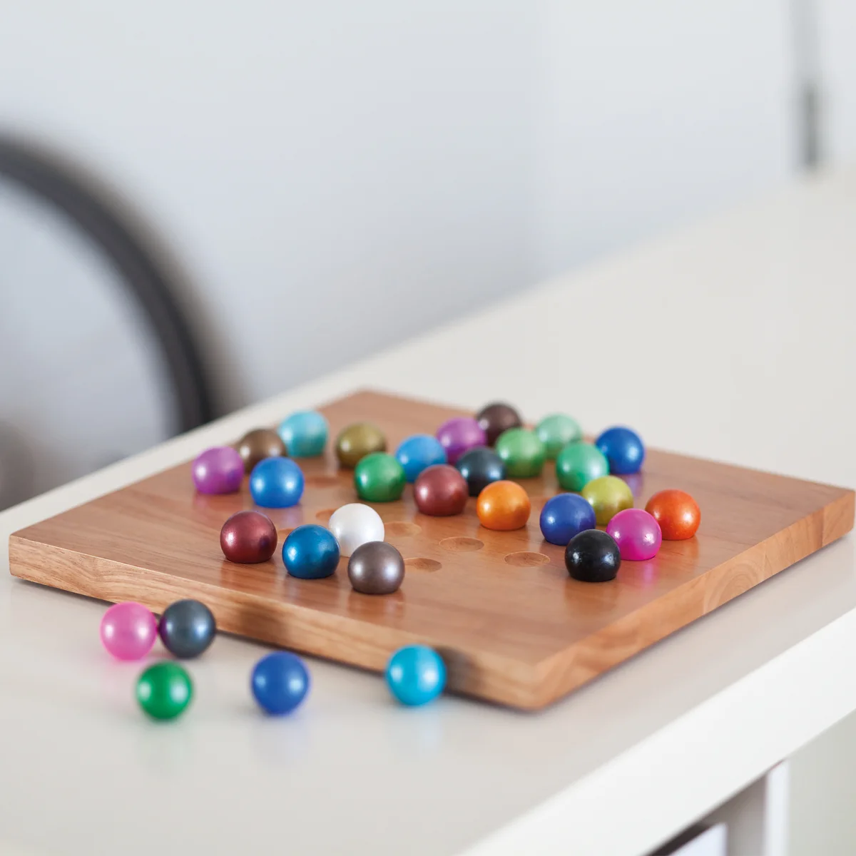 À partir de 5 ans, plateau de jeu et 32 balles de jeu (colorées, dans un sac en tissu), règles du jeu incluses Matériau du plateau de jeu : bois (hévéa), Matériau des balles de jeu : verre dépoli