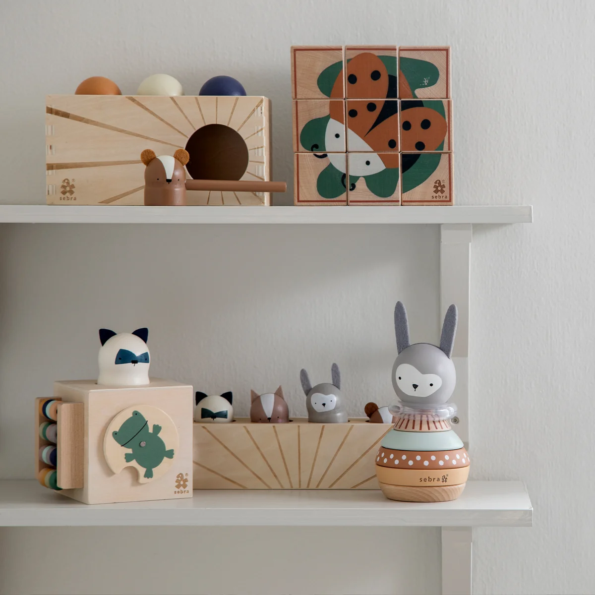 Le cube de découverte de Sebra offre sur chaque face une expérience d'activité particulière qui non seulement divertit les enfants, mais leur permet aussi de développer une conscience aiguë des formes.