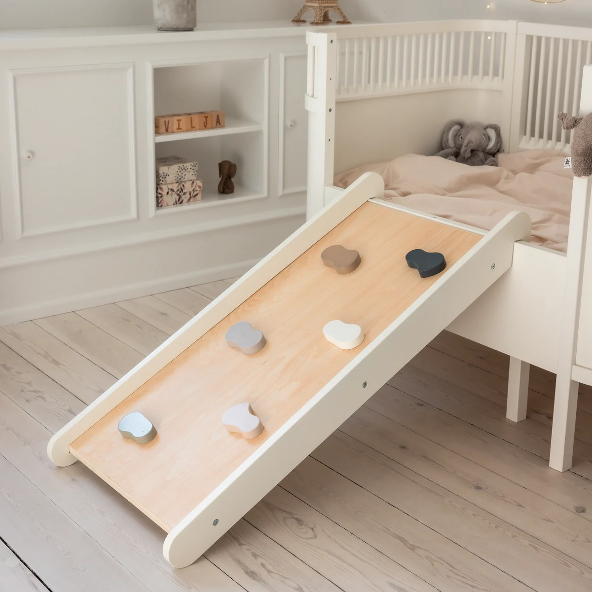 Fabriqué à partir de matériaux robustes et de qualité, le mur d'escalade et le toboggan sont sûrs et durables, tandis que le design scandinave intemporel s'intègre harmonieusement dans chaque chambre d'enfant. Un accessoire astucieux qui allie avec charme le jeu et le sommeil.
