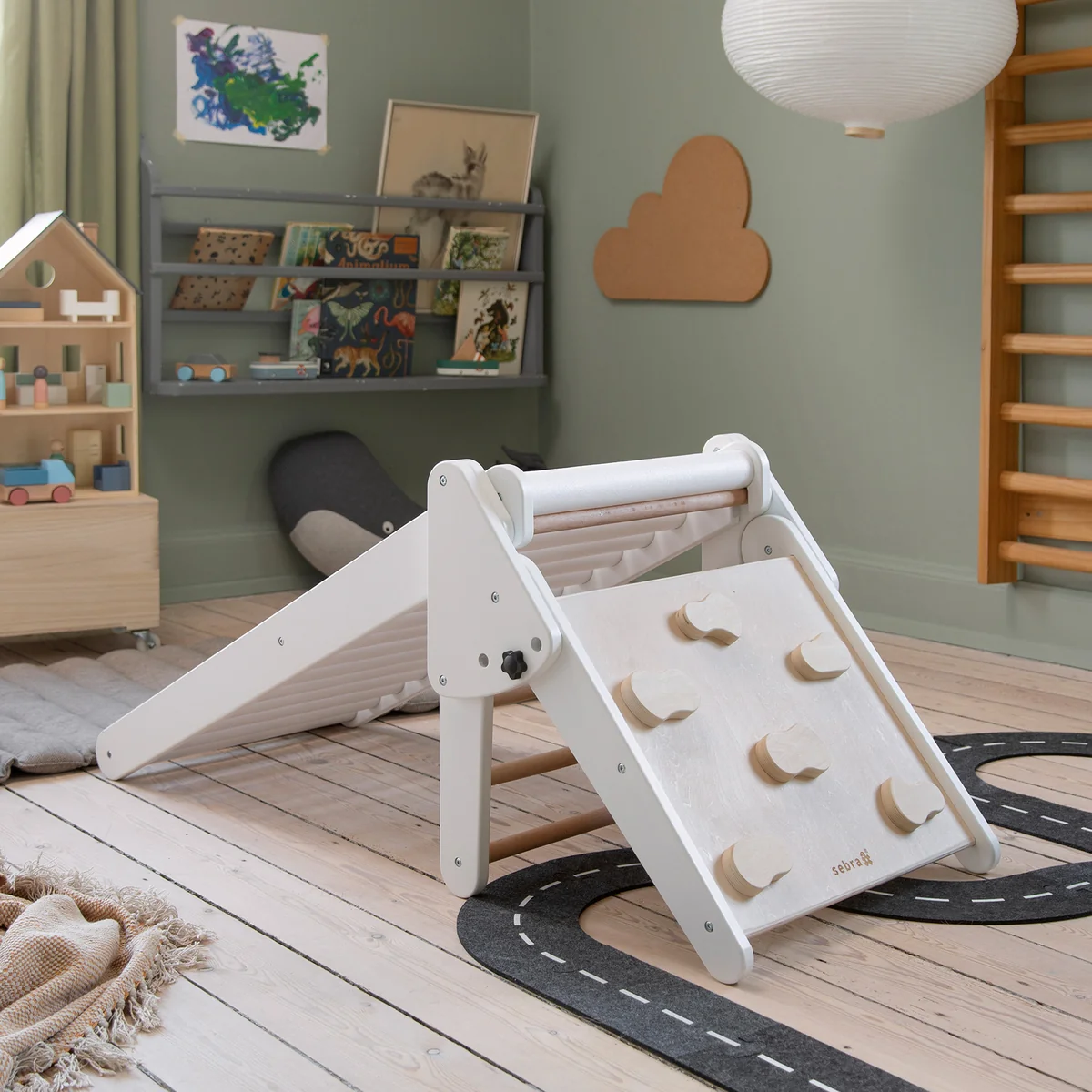 Le toboggan à rouleaux de Sebra donne une note amusante au moment de se coucher et de se lever. Le toboggan se forme de rouleaux en mousse souples et agréables qui garantissent que les enfants ne se blessent pas en les utilisant. En grimpant, l'enfant est confronté à des défis, car il n'est pas aussi facile de monter que de descendre. Le toboggan multifonctionnel peut encore être élargi et complété par le triangle d'escalade .