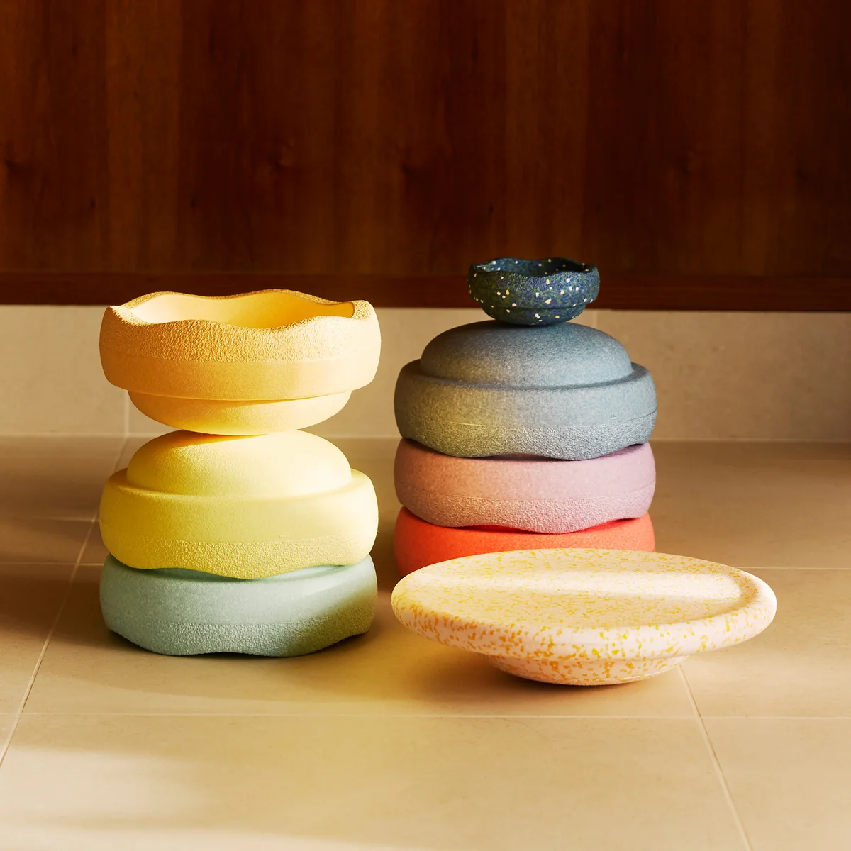 Le jeu Stapelstein® - Rainbow enthousiasme par sa polyvalence élégante ! Ce superbe set de six pierres à empiler et la planche Confetti ne doivent manquer à aucune famille. Chaque pierre peut supporter jusqu'à 180 kg de charge, ce qui permet non seulement aux plus petits membres de la famille, mais aussi à maman, papa, grand-mère, grand-père et autres d'élargir leurs capacités d'équilibre.