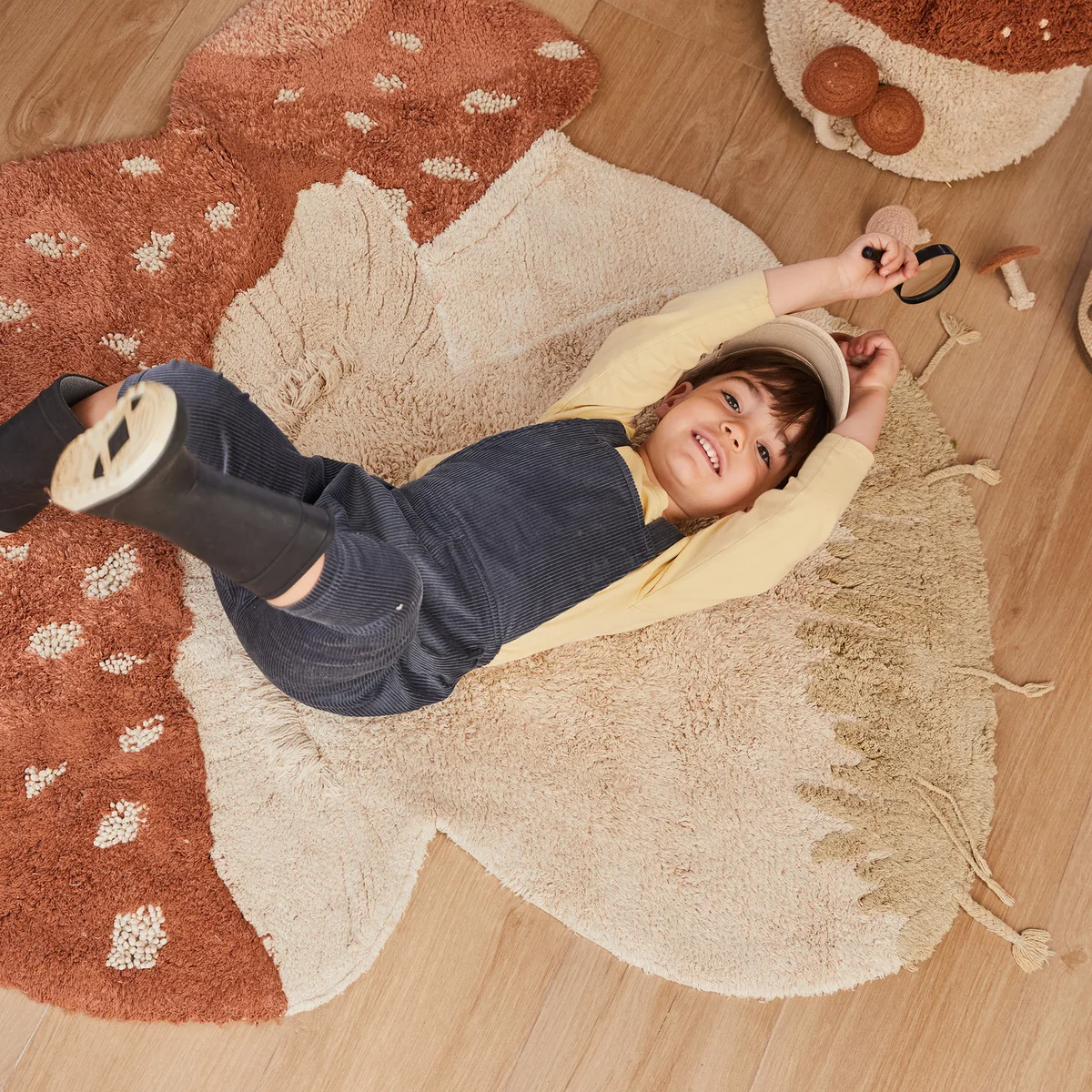 Le design du tapis champignon mouche s'inspire de la nature et représente un mignon champignon mouche aux couleurs vives sur un fond neutre. Ce motif ludique capte l'imagination des enfants et confère à la pièce une atmosphère joyeuse.