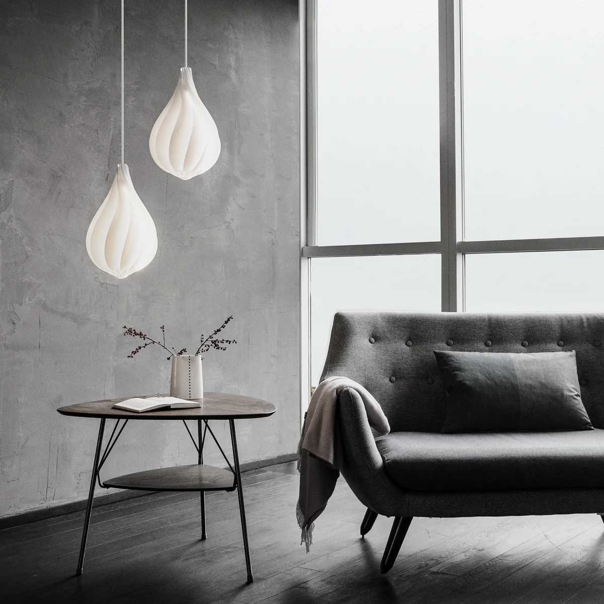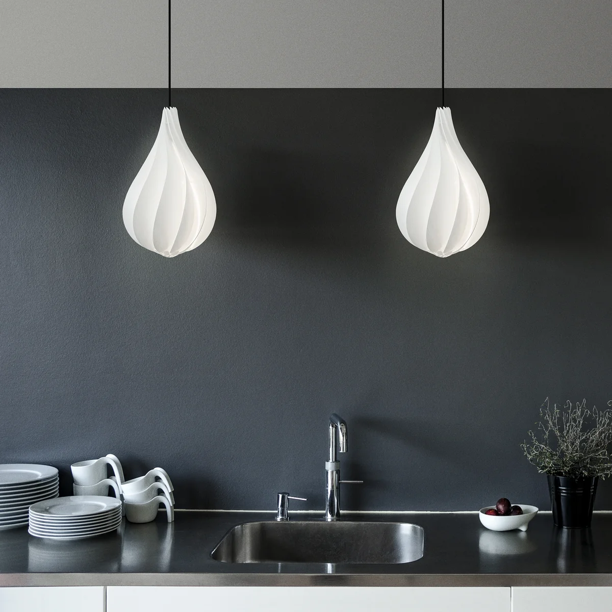 L'abat-jour Alva de Umage fait office d'enveloppe pour une suspension lumineuse. Avec sa forme de spirale, qui se déroule à la manière d'une goutte d'eau, la lampe design claire est un accroche-regard dans la cuisine, l'entrée, le salon, la chambre ou la salle à la manger. Cet abat-jour en plastique est l'œuvre de Lorenzo Radaelli.