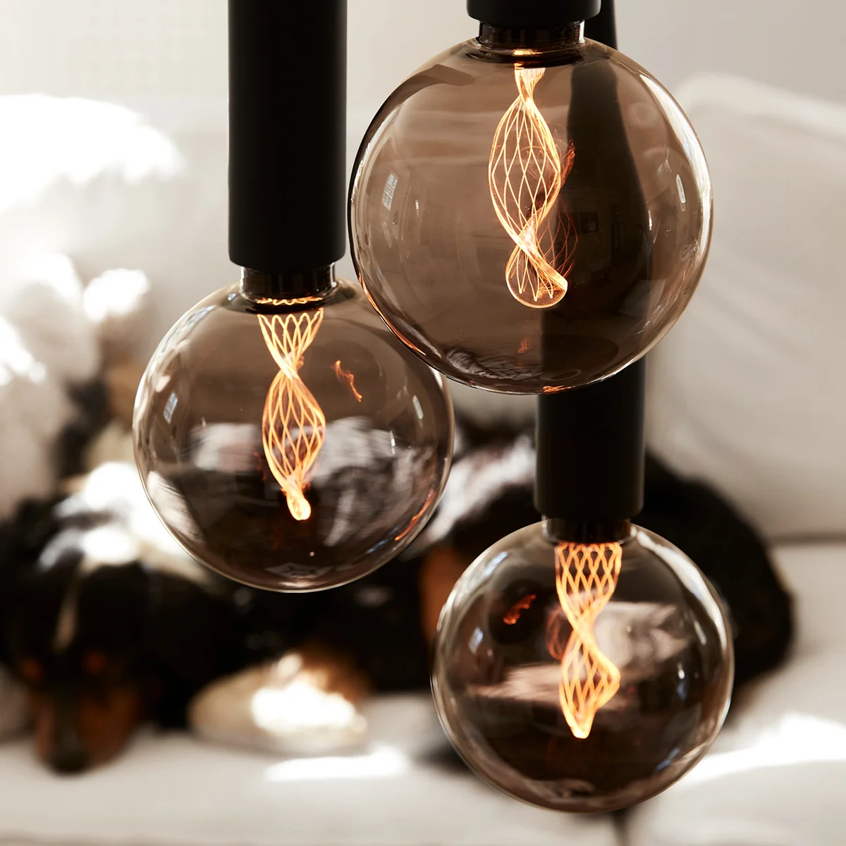 L'ampoule LED Curve du fabricant suédois NUD Collection séduit par son design exceptionnel et extrêmement moderne. La colonne torsadée à l'intérieur éclaire l'ampoule de manière merveilleuse. Le contraste entre le verre noir teinté et la source lumineuse attire l'attention dans tous les espaces de vie. Que ce soit en suspension ou à la verticale.