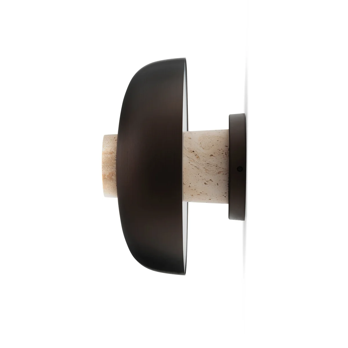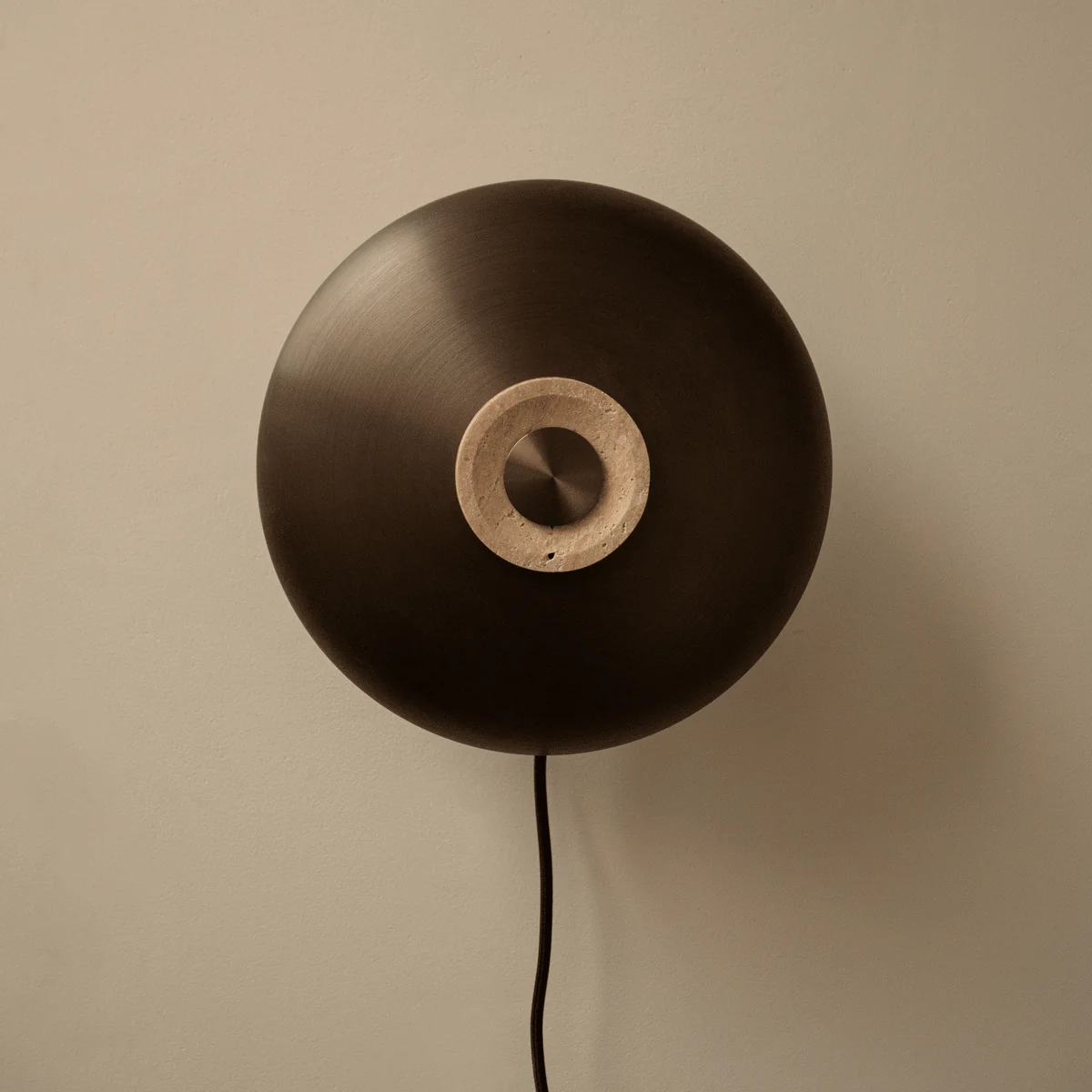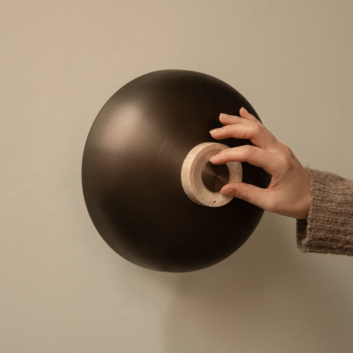 L'applique murale Reverse LED de Audo associe des matériaux naturels bruts à un artisanat raffiné, créant un équilibre de tension et d'harmonie. Inspiré par les formes géométriques, le support mural est en pierre de travertin non traitée, dont la forme conique et les irrégularités naturelles soulignent la beauté des structures organiques. En contraste, le diffuseur incurvé en aluminium anodisé bronzé présente une surface lisse qui confère une touche d'élégance au design.