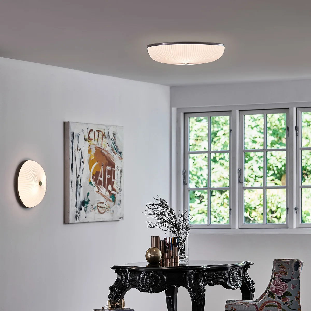 Le luminaire est en plastique et est disponible en différents diamètres. Des détails en argent ou en or complètent le design et créent une lumière intemporelle qui attire le regard. Lamella est une solution d'éclairage pratique et esthétique, à la fois seule et en différentes tailles avec plusieurs au mur ou au plafond.