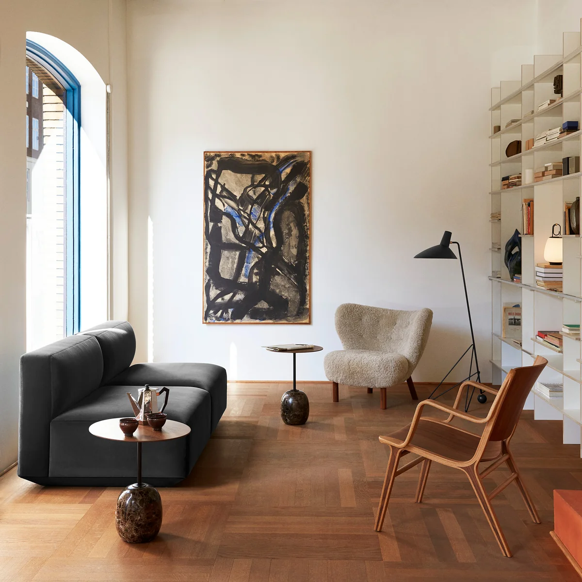 Le lampadaire Tripod HM8 de & Tradition reflète le minimalisme épuré de Hvidt & Mølgaard. Le lampadaire en aluminium laqué et en acier avec des détails en laiton crée un équilibre subtil entre la simplicité stricte de son design et la douceur créée par les bords incurvés de son support à trois pieds. Bien que la lampe ait été conçue en 1953, elle est maintenant lancée pour la première fois par & Tradition lancée en 2010.