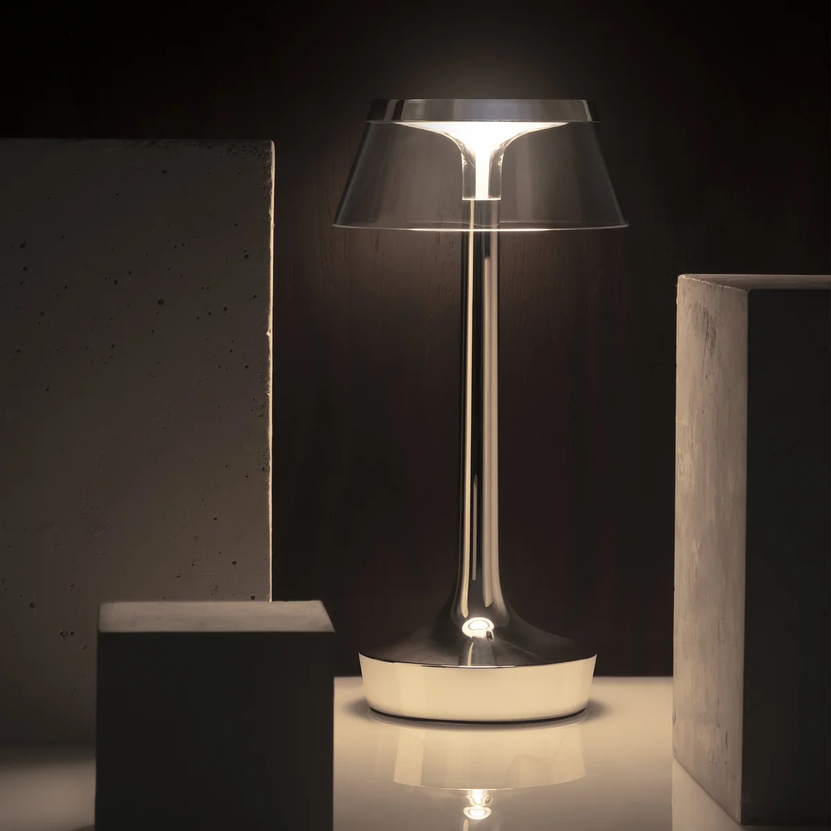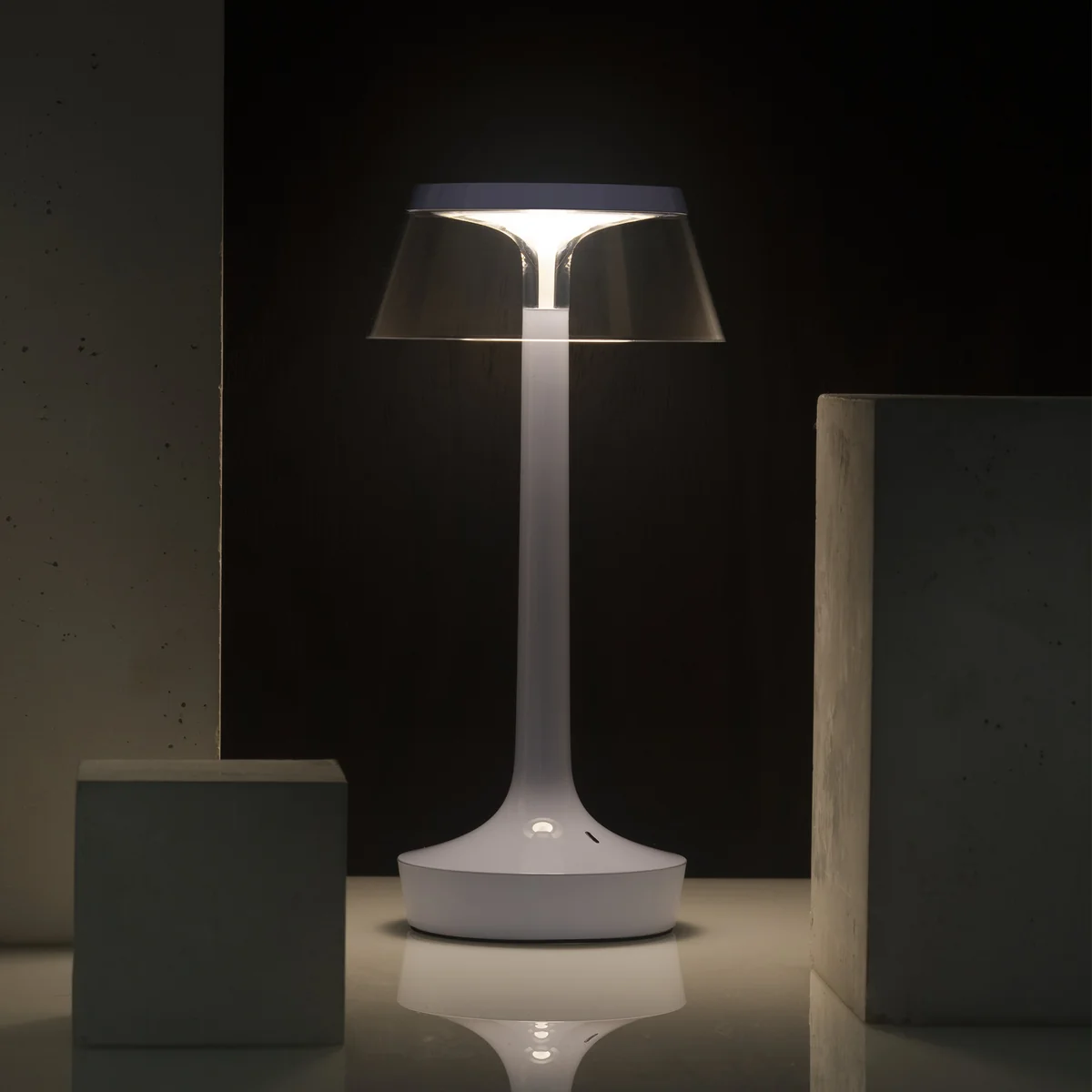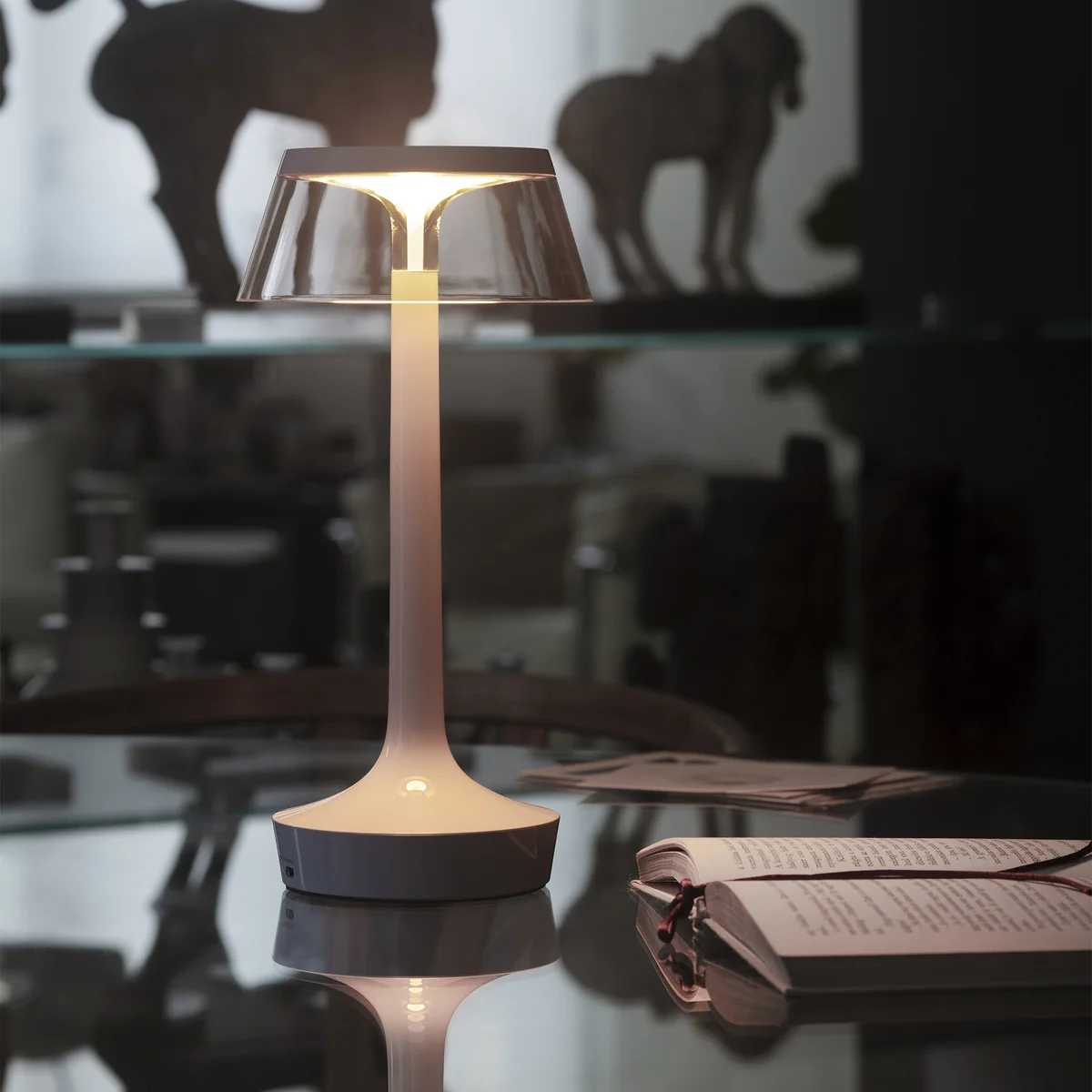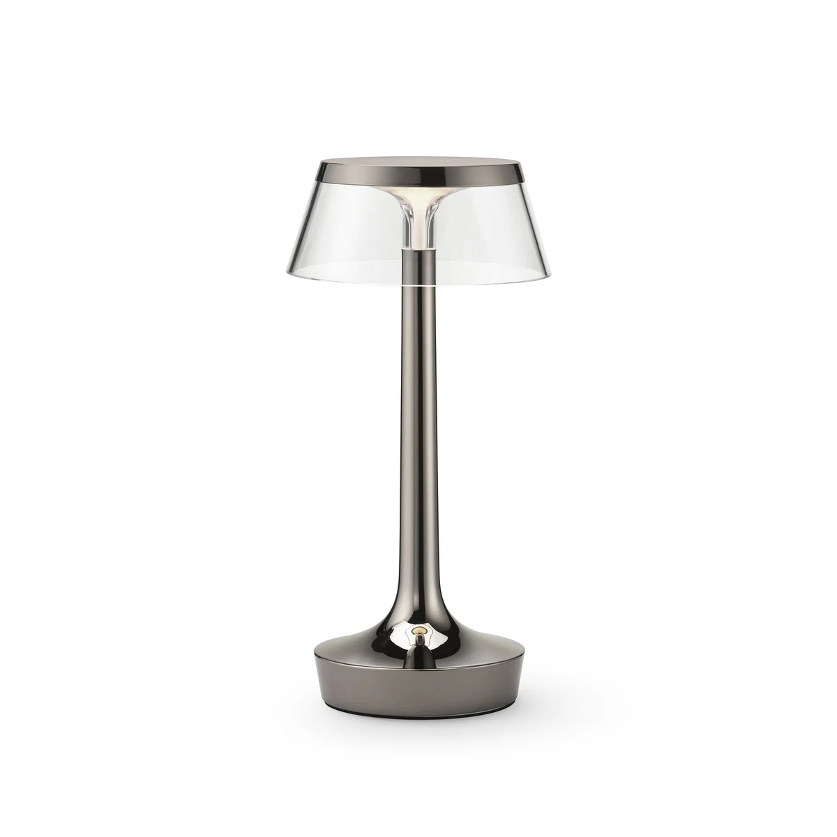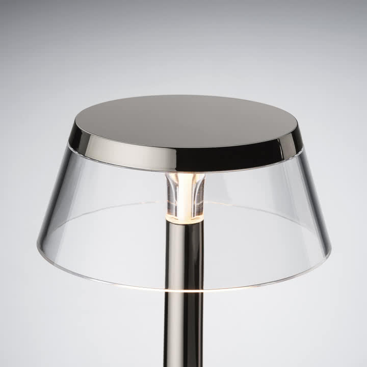 Bon Jour Unplugged La lampe de bureau LED rechargeable Color Tune de Flos allie un design iconique à une technologie d'éclairage de pointe - sans fil, mobile et réglable individuellement. Conçue par Philippe Starck, la lampe séduit par sa silhouette élancée et ses lignes claires. La base transparente et l'abat-jour interchangeable créent un effet élégant et flottant qui donne du style à n'importe quelle ambiance.