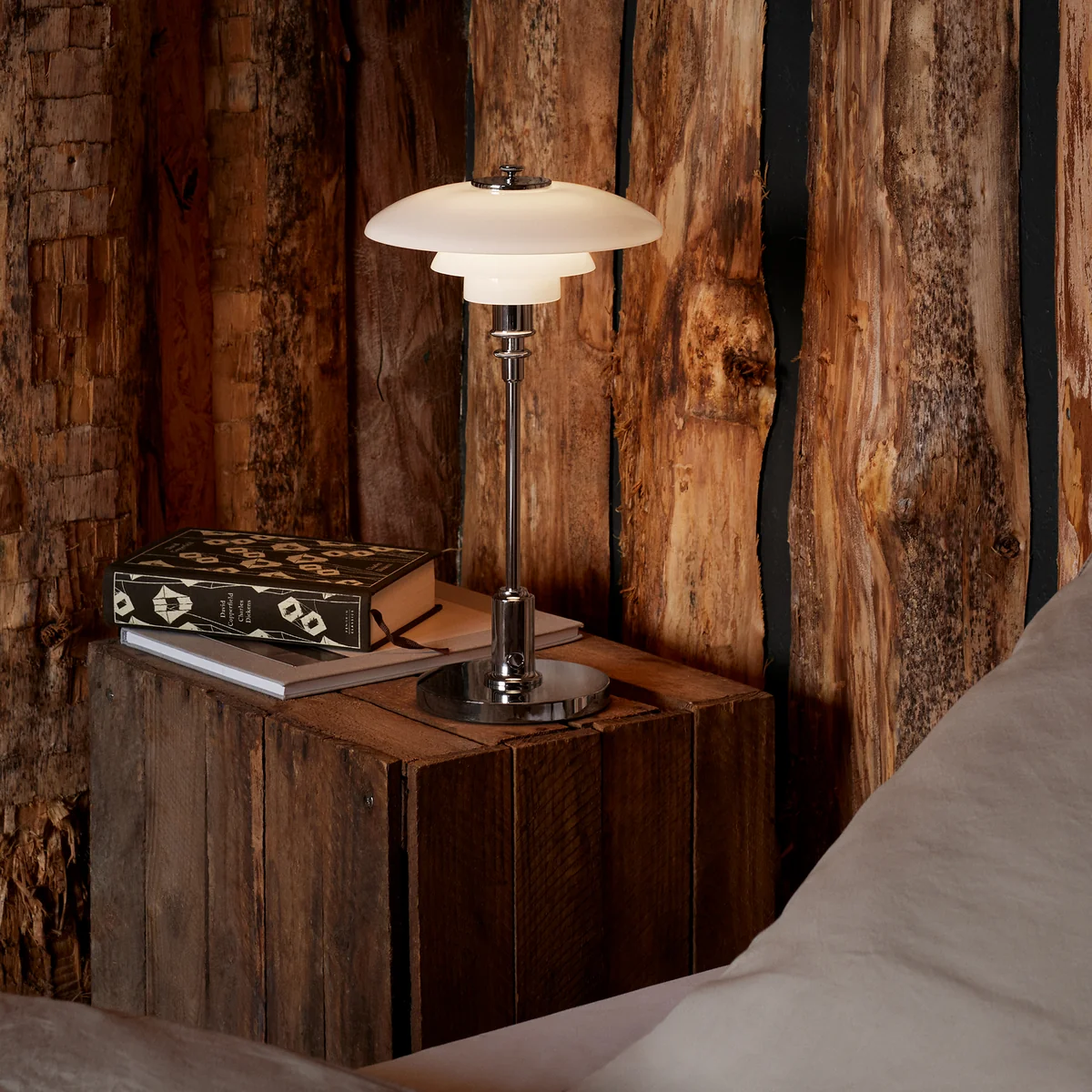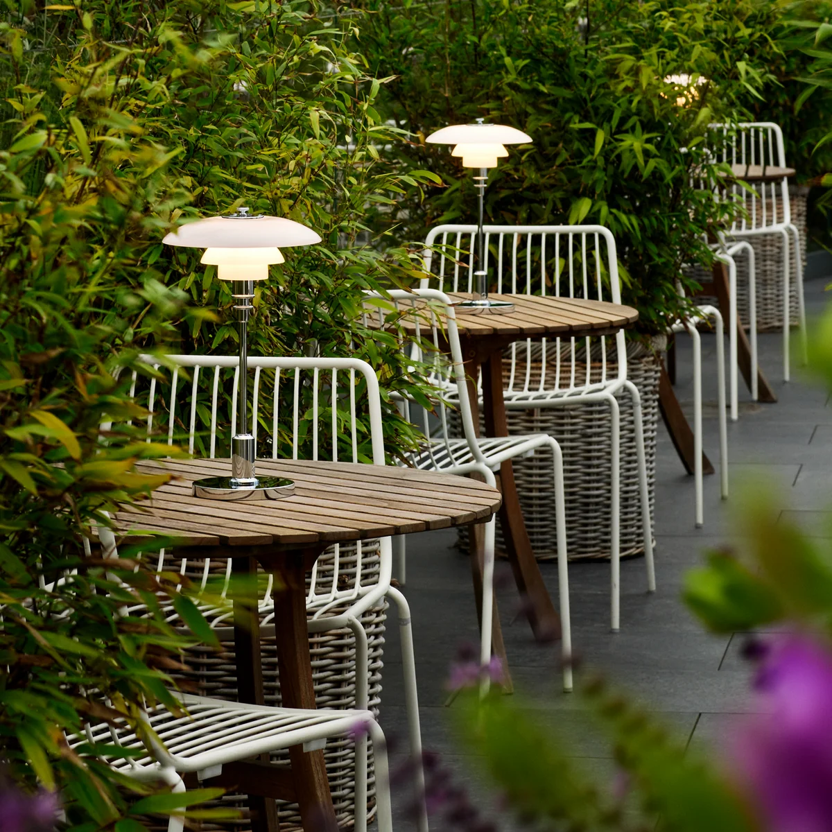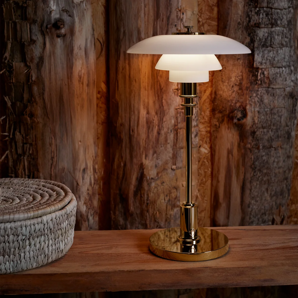 La lampe de table LED PH 2/1 Portable Akku de Poul Henningsen pour Louis Poulsen a été conçue en se basant sur le principe d'un système de trois abat-jour réfléchissants qui assure une émission de lumière majoritairement vers le bas. Les abat-jour sont constitués de trois couches de verre opale soufflé à la bouche, la couche extérieure étant brillante et la couche intérieure étant sablée et mate. Il en résulte une répartition douce et uniforme de la lumière dans la pièce.
