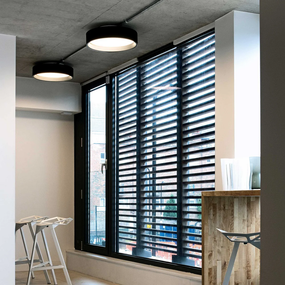 La lampe Circle émet une lumière diffuse grâce à un diffuseur en acrylique hautement efficace. Le diffuseur, entouré d'un anneau volumineux coloré ou blanc, est dissimulé lorsqu'il est observé à partir d'un angle faible. Une gradation de 5° de l'intérieur de l'anneau crée un dégradé agréable et décoratif de la lumière du diffuseur. Le luminaire lui-même « flotte dans les airs » à une distance de 34 mm du plafond, créant ainsi une certaine légèreté visuelle.