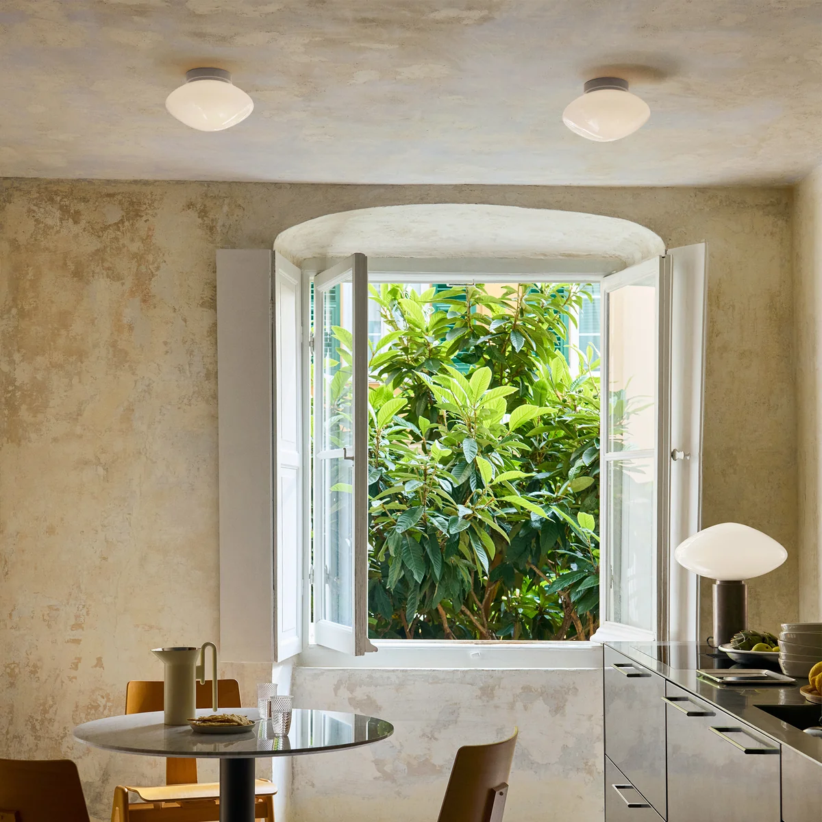 Le Mist plafonnier et applique murale de & Tradition conçu par le studio de design danois All the Way to Paris, est une évolution de l'emblématique Mist -design de la lampe. Grâce à sa double fonction, elle peut être installée aussi bien au mur qu'au plafond et s'adapte parfaitement à chaque pièce. L'abat-jour en verre soufflé à la bouche assure une diffusion douce et diffuse de la lumière, tandis que la forme épurée allie élégance intemporelle et fonctionnalité.