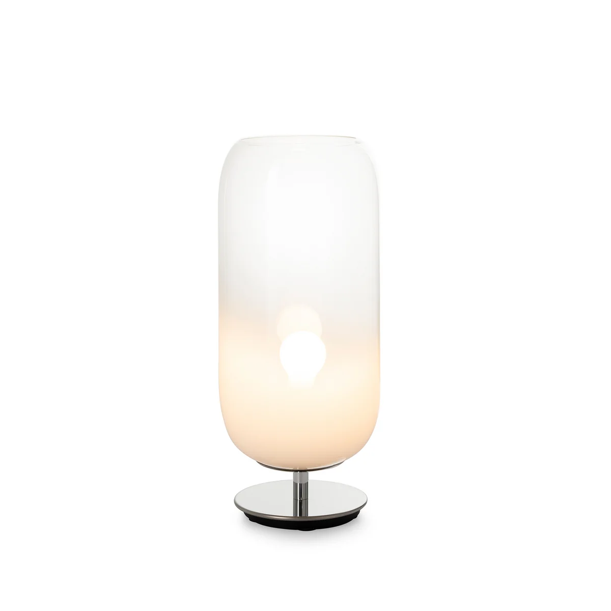 La lampe de table Gople Mini de Bjarke Ingels pour Artemide fascine par son beau dégradé de couleurs et ses formes fluides. L'objet design en verre fournit une lumière diffuse et agréable dans la chambre ou le salon et sert en même temps d'accroche décorative sur les tables de chevet ou les tables basses. Selon une vieille tradition vénitienne, cette lampe en verre blanc et verre de cristal a été soufflée à la bouche, de sorte que chaque pièce est unique. La lampe de table obtient la touche finale et brillante grâce à une métallisation sous vide innovante.