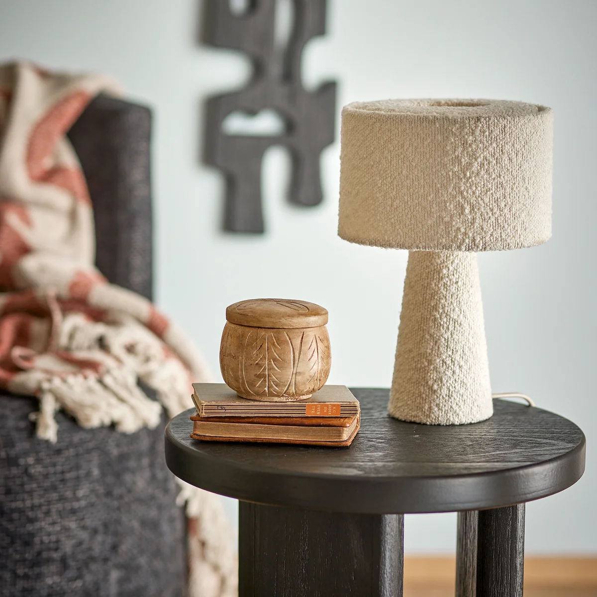 La lampe de table Emmie de Bloomingville allie une forme simple à une surface texturée à l'aspect bouclé. Sa lumière douce crée une atmosphère confortable - parfaite pour la table de nuit, l'étagère ou les coins calmes nécessitant une lumière d'ambiance.