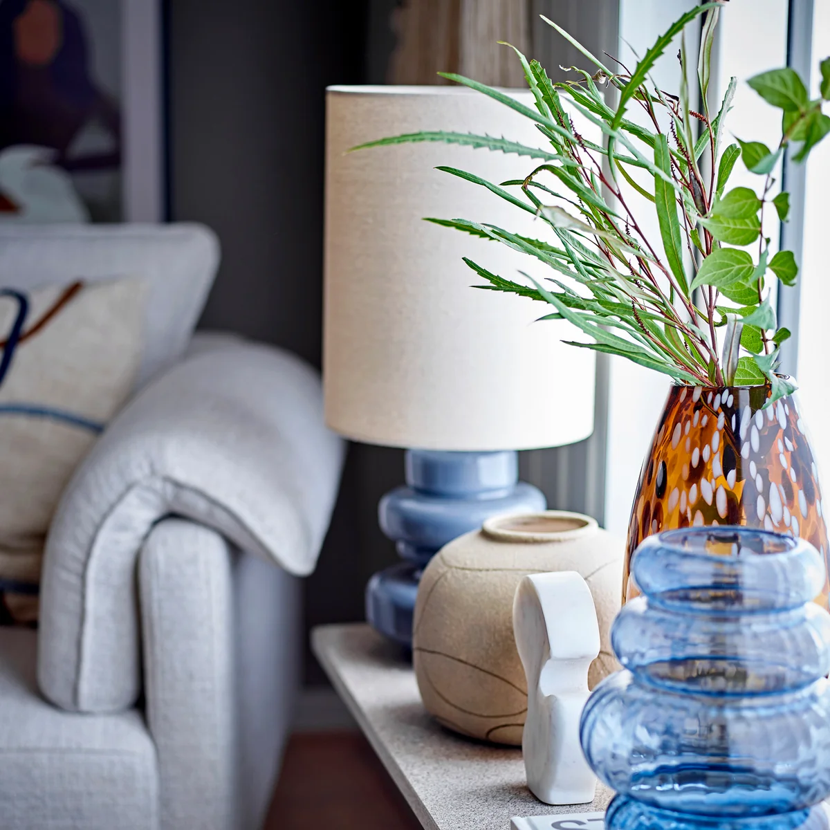 La lampe de table Fabiola de Bloomingville a un pied en verre bleu d'une belle forme ondulée et organique. Elle est parfaitement accompagnée d'un abat-jour blanc sobre en lin.