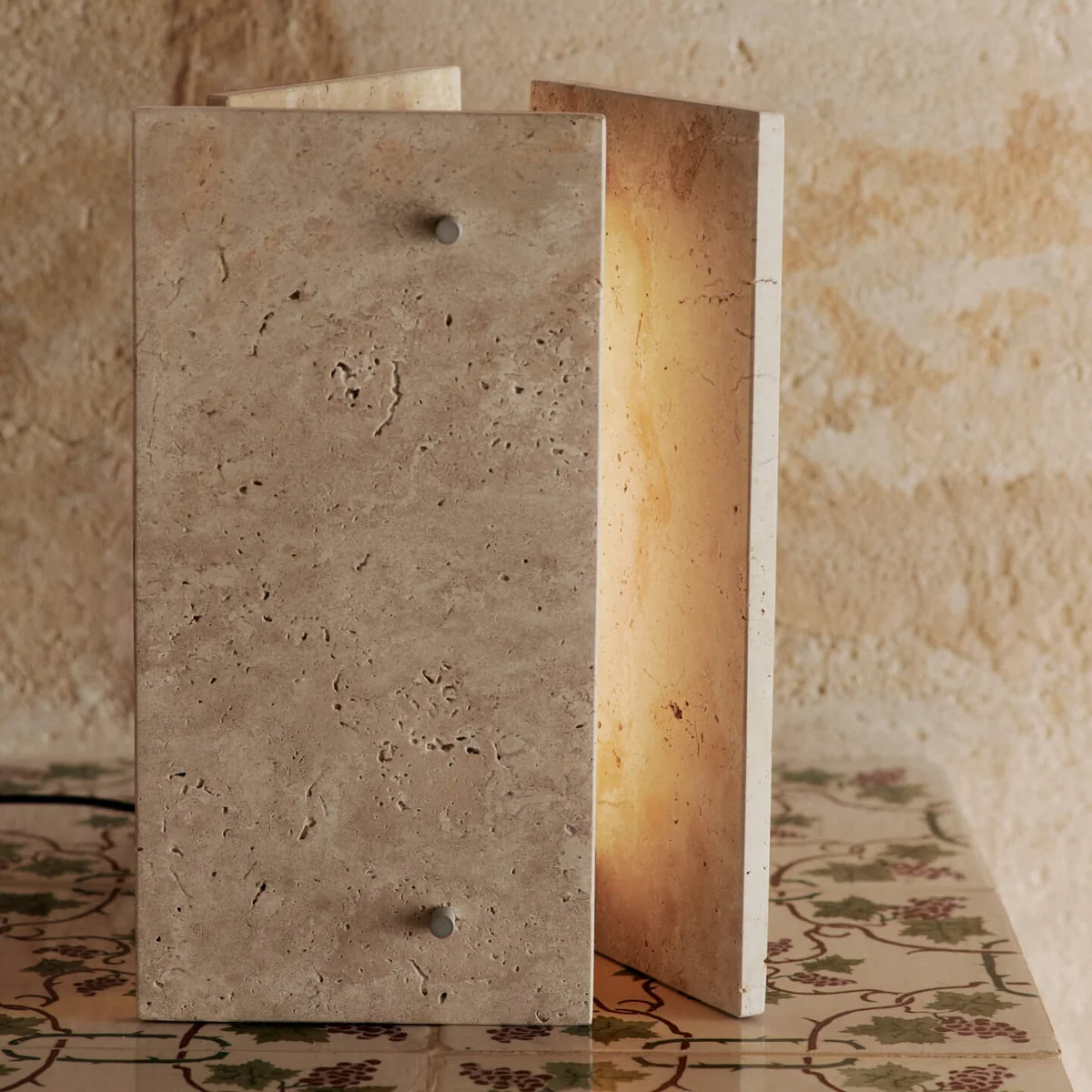 Trois panneaux de travertin entourent la source de lumière centrale et créent un jeu fascinant d'ombre et de lumière. La structure naturelle de la pierre renforce la lumière chaude et diffuse et crée une atmosphère douce et architecturale. La lampe est livrée dans un emballage plat, elle est facile à monter et dispose d'une fonction de gradation intégrée. Il allie ainsi matérialité et fonctionnalité et offre une solution d'éclairage stylée pour chaque pièce.
