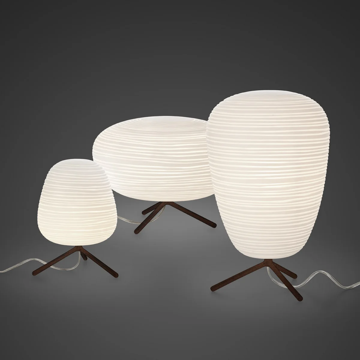 Toute la série de lampes Rituals comprend des suspensions et des lampes de table. Les lampes de table Rituals émettent une lumière diffuse. La collection propose trois formes de diffuseurs en verre soufflé à la bouche en utilisant une technique de soufflage dans laquelle le verre est soufflé en place et non tourné dans le moule (appelé "a fermo"). L'effet de bande est obtenu à l'aide d'un moule avec des décorations négatives qui se répètent sur la surface du verre. Le verre est ensuite limé à la main et soumis à un processus d'immersion acide pour créer un effet de plâtre.
