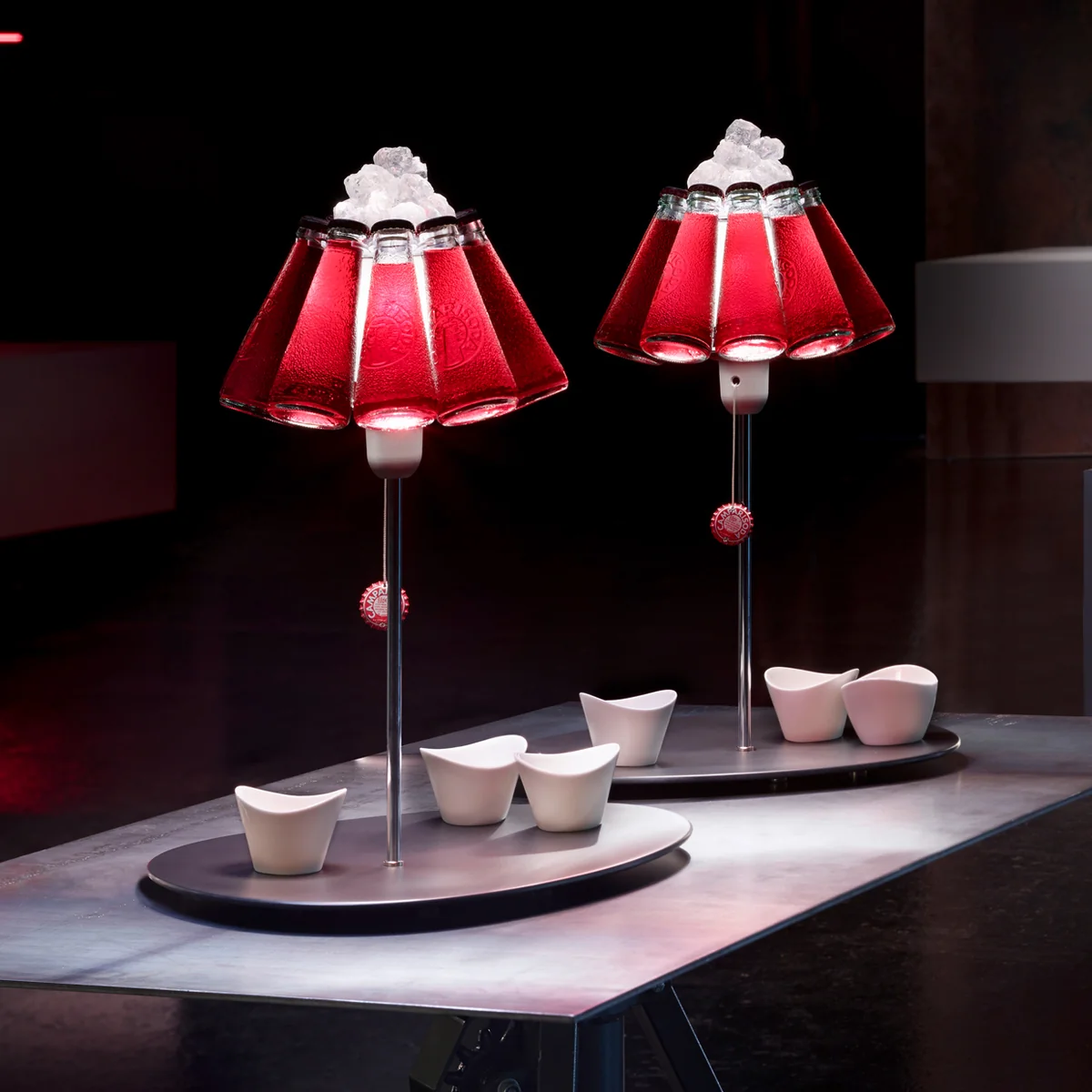 La base de la lampe est en plastique, le support est en métal, les glaçons sont en verre et l'abat-jour est fait de bouteilles Campari originales, amovibles et remplaçables. Le câble est transparent.