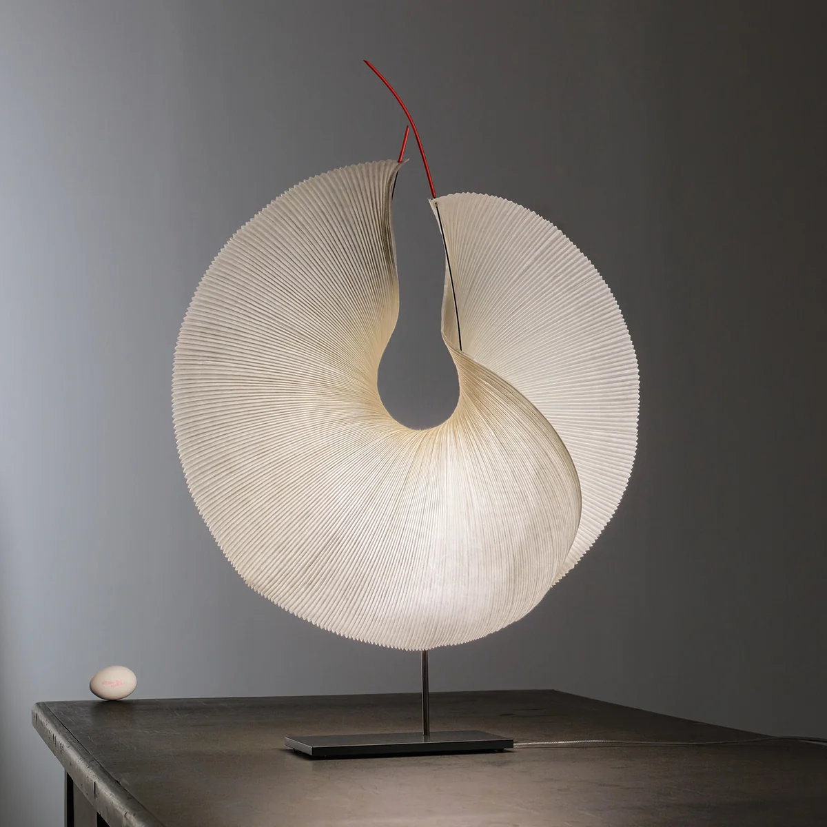 La lampe de table Yoruba Rose LED d'une grâce délicate et d'une perfection Ingo Maurer enchanteresse. Son design lumineux et sa lumière chaude et douce en font la lampe idéale pour les pièces où vous souhaitez vous détendre. Comme une fleur qui s'élève, l'arc du papier japonais s'étend sur les minces fils métalliques, créant un effet tridimensionnel. Les détails rouges à l'extrémité supérieure ressemblent à une cicatrice de fleur et confèrent à l'objet de design son élégance.