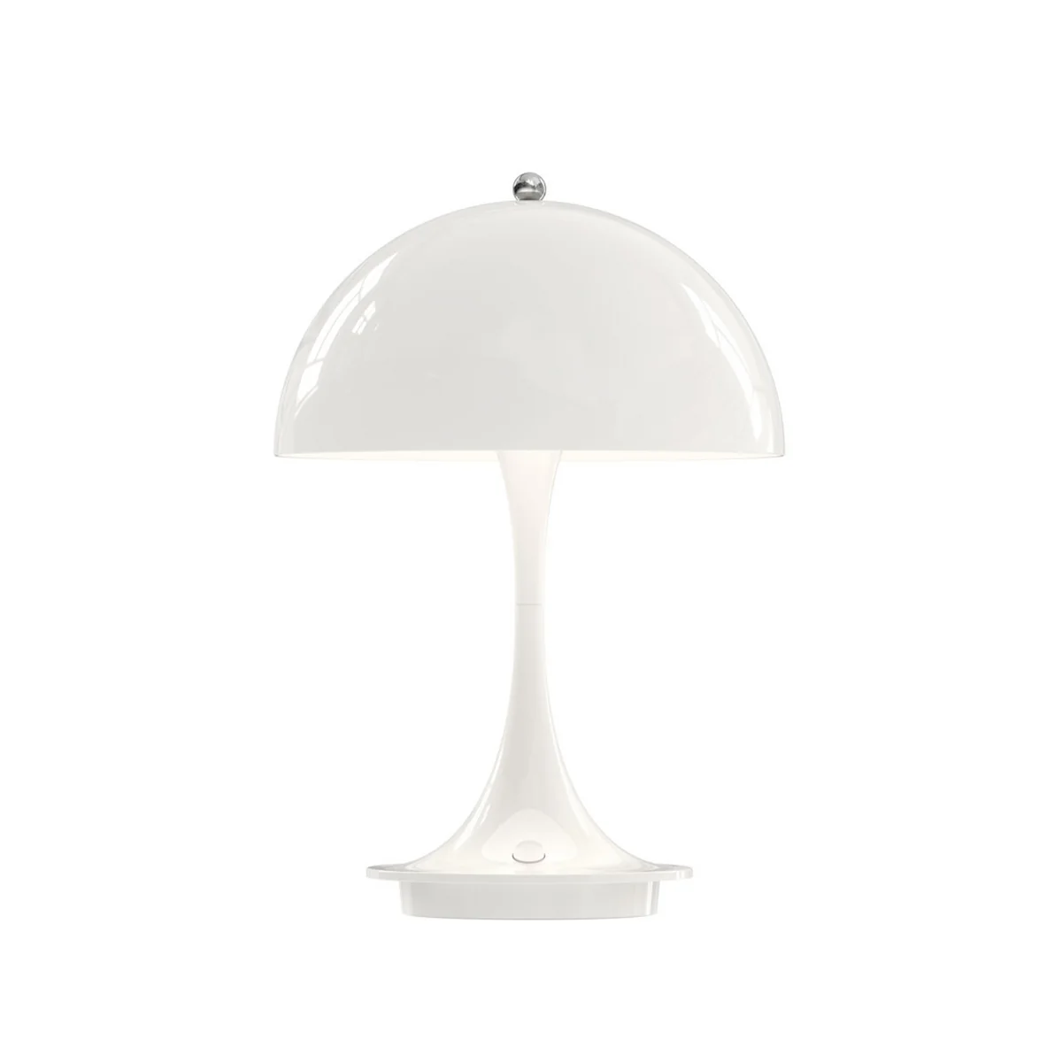 Panton voulait créer un luminaire dont non seulement l'abat-jour mais aussi le pied servent de réflecteur. Le luminaire portable est fabriqué avec un abat-jour en acrylique moulé par injection et un pied en aluminium moulé sous pression. Il est également possible de choisir entre les variantes entièrement en métal ou en acrylique avec un pied en aluminium. La lampe peut être rechargée sans fil ou via un port USB. Elle peut ainsi être utilisée sur le balcon ou dans le jardin et éclairer partout où il n'y a pas de prise de courant. En outre, la lampe peut être réglée sur trois niveaux.