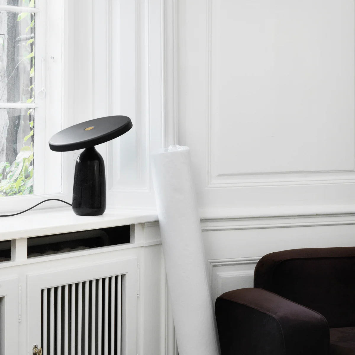 La lampe de table LED Eddy de Simon Legald pour Normann Copenhagen effectue un véritable acte d'équilibriste. Un abat-jour circulaire en acier pressé mobile flotte avec légèreté au-dessus de la base en marbre massif aux formes douces, formant ainsi un design tout en mouvement.
