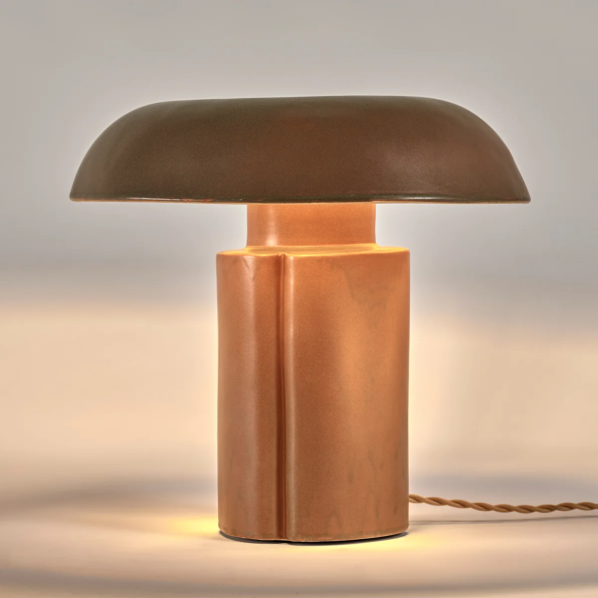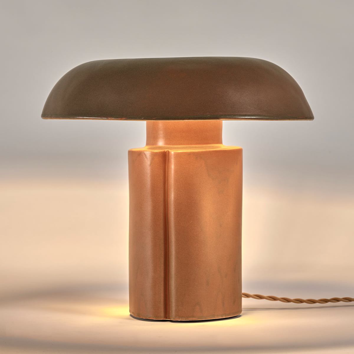 La lampe Oliver lampe de table de Serax allie charme rustique et détails luxueux. Fabriquée en faïence robuste, elle se distingue par son émail ocre chaleureux et son extérieur bleu profond, rehaussé de l'émail réactif typique d'Anita Le Grelle.