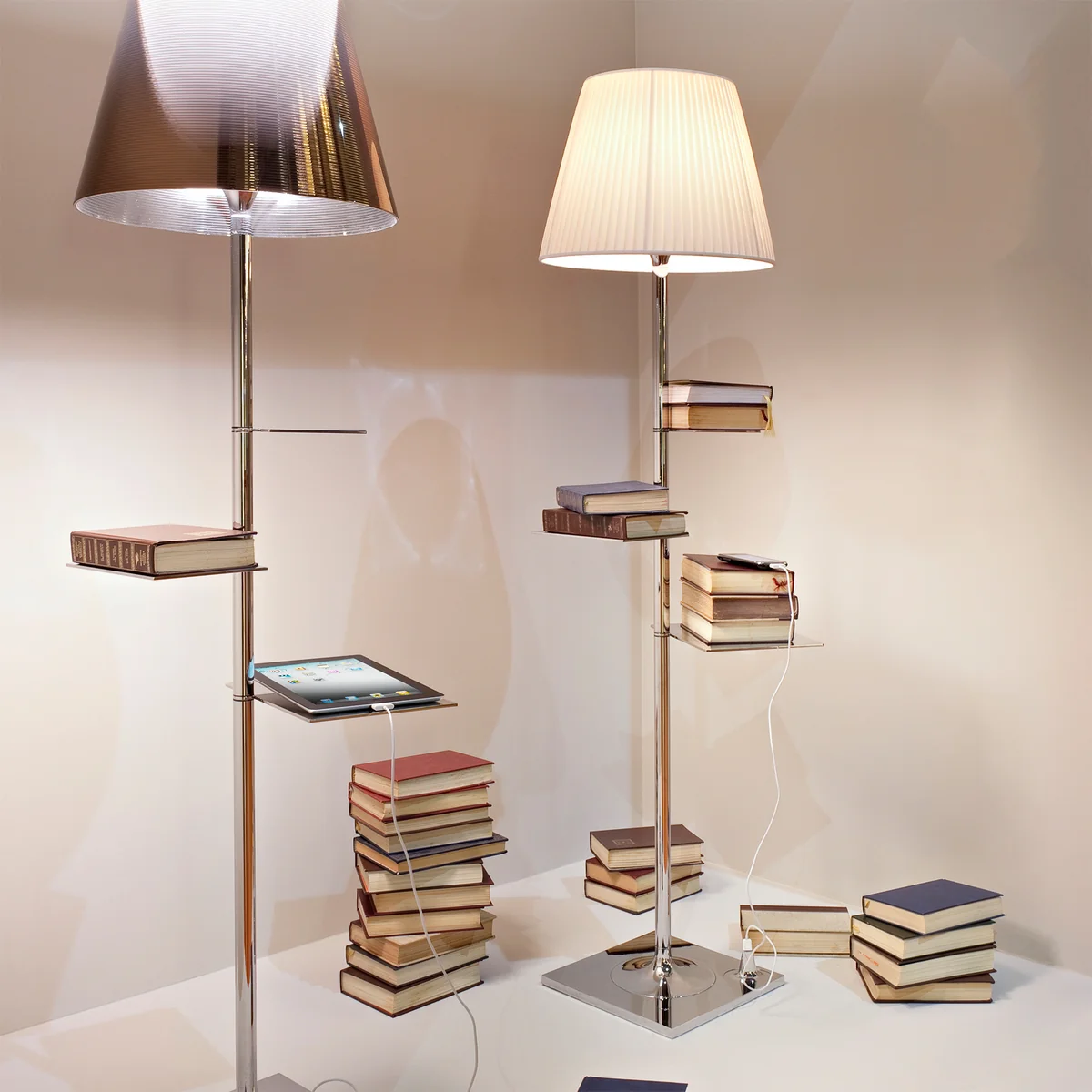 Le lampadaire Bibliotheque Nationale de Flos est un hommage à la célèbre Bibliothèque nationale de France à Paris. Les trois consoles de tailles différentes fixées au support de la lampe, qui servent de rangement pour les livres, les smartphones et autres, sont une caractéristique particulière de la lampe. Les appareils électroniques peuvent également être chargés en utilisant le port USB du socle. Le concepteur de ce projet est Philippe Starck.