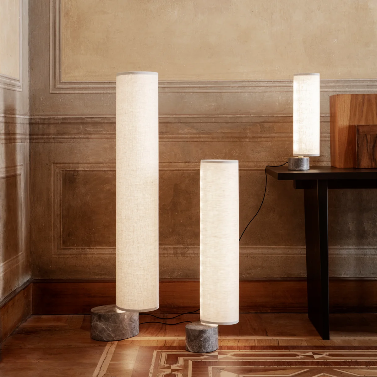 Le site Unbound de Space Copenhagen pour Gubi se compose de lampes de différentes tailles qui peuvent être parfaitement combinées. La base est en marbre, l'abat-jour élancé est disponible en tissu de voile ou en lin.