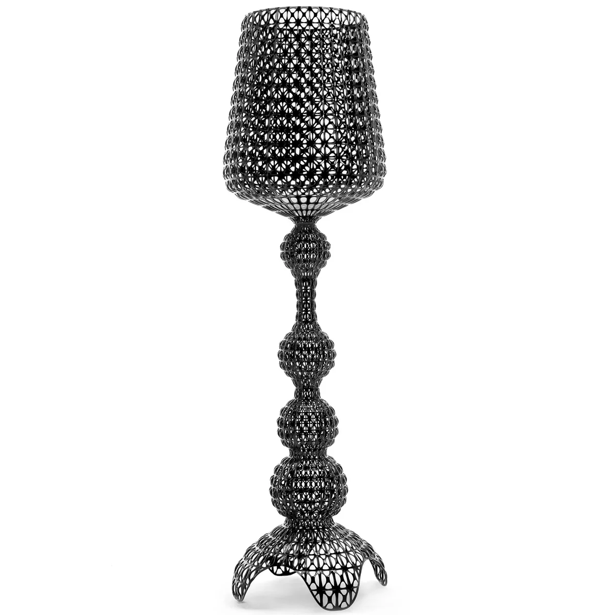 Le lampadaire LED Kabuki de Pietro Ferruccio Laviani pour Kartell est une diva néobaroque dans une robe en dentelle. S'inspirant des grands décors détaillés du théâtre japonais Kabuki, Laviani associe ses idées avec une production moderne et fabrique le luminaire en plastique teinté et moulé dans la masse.