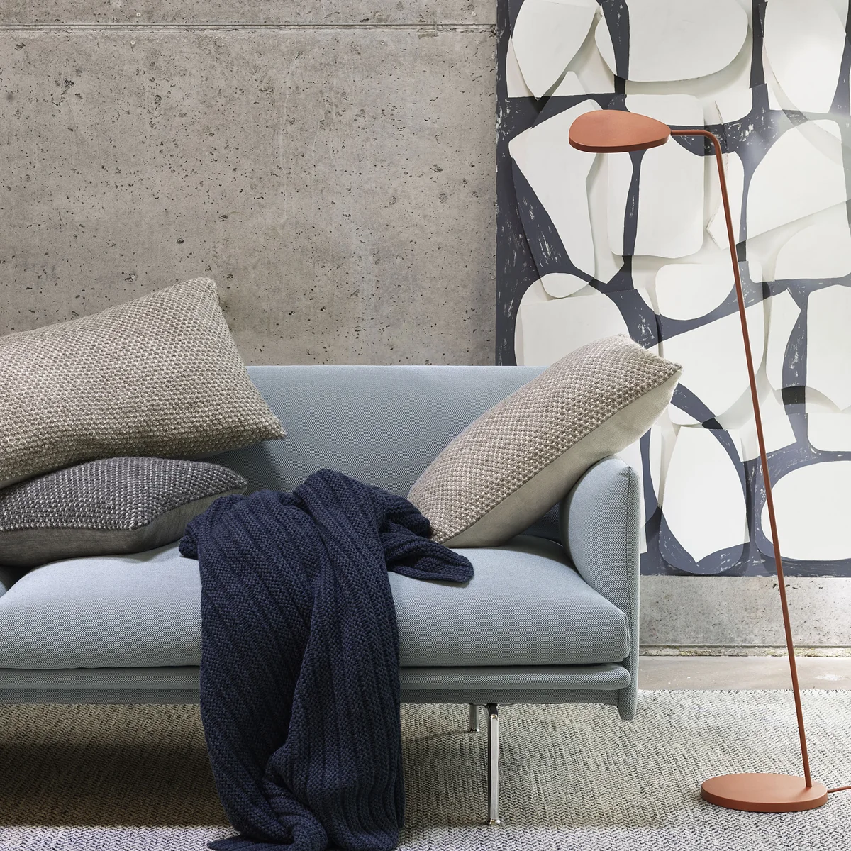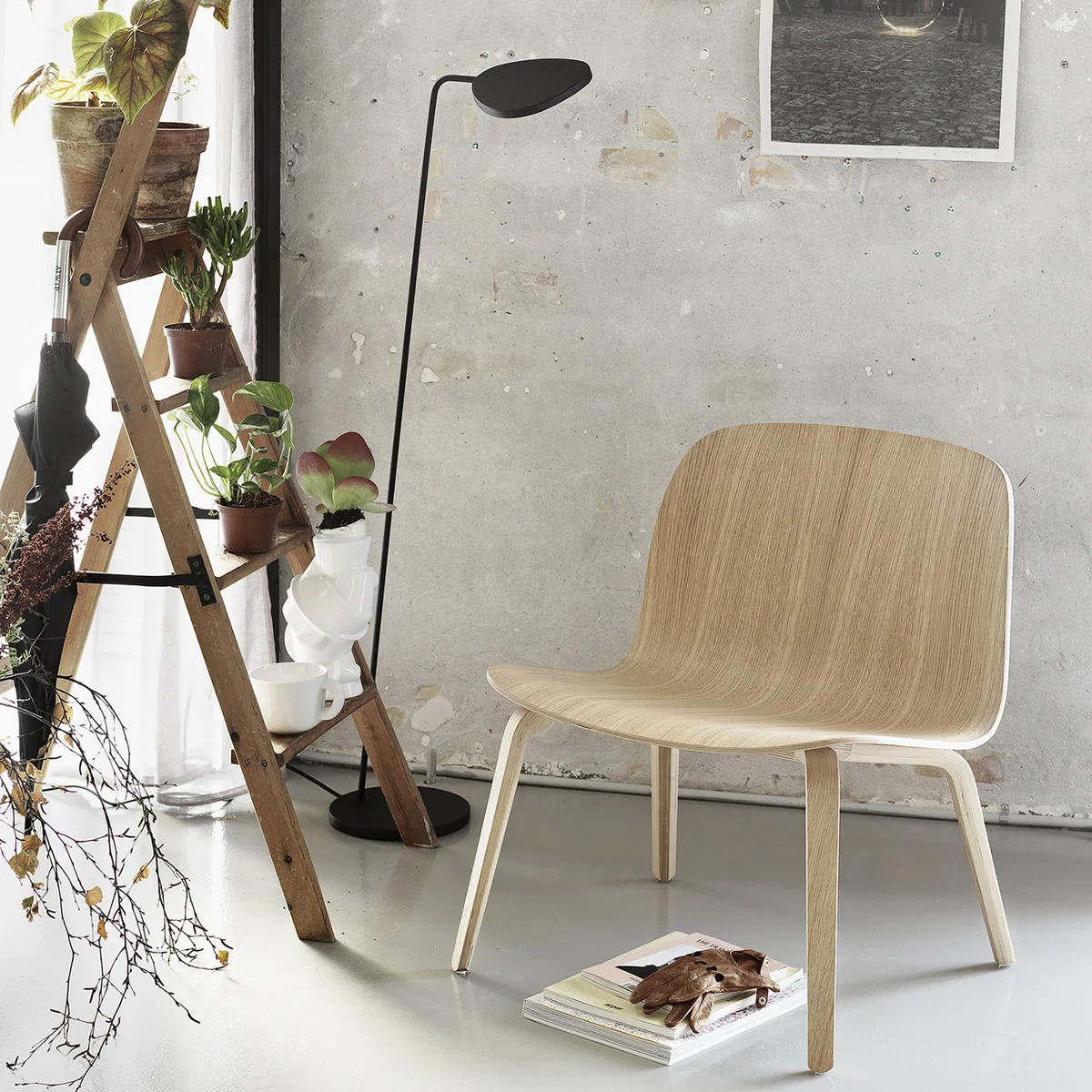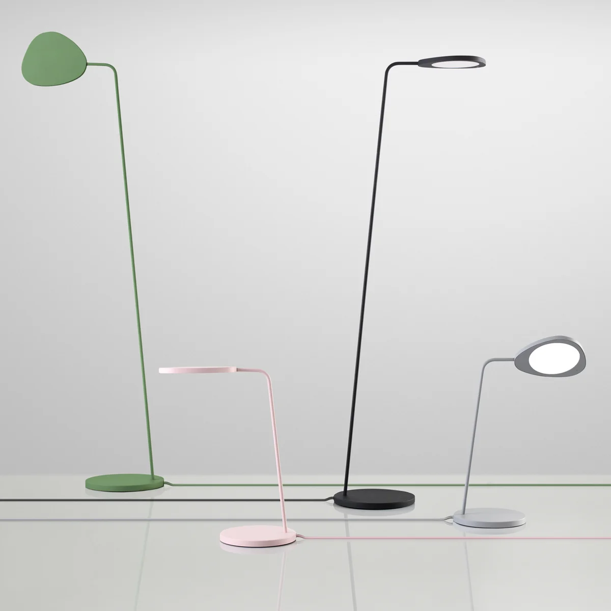 Le lampadaire Leaf exprime, selon l'angle de vue, l'un ou l'autre des langages conceptuels. La version Leaf en aluminium produite par Muuto est disponible en lampe de table, qui est mise particulièrement en valeur, lorqu'elle est combinée avec la version lampadaire. La lampe est reglable et peut créer donc dofférentes ambiances.