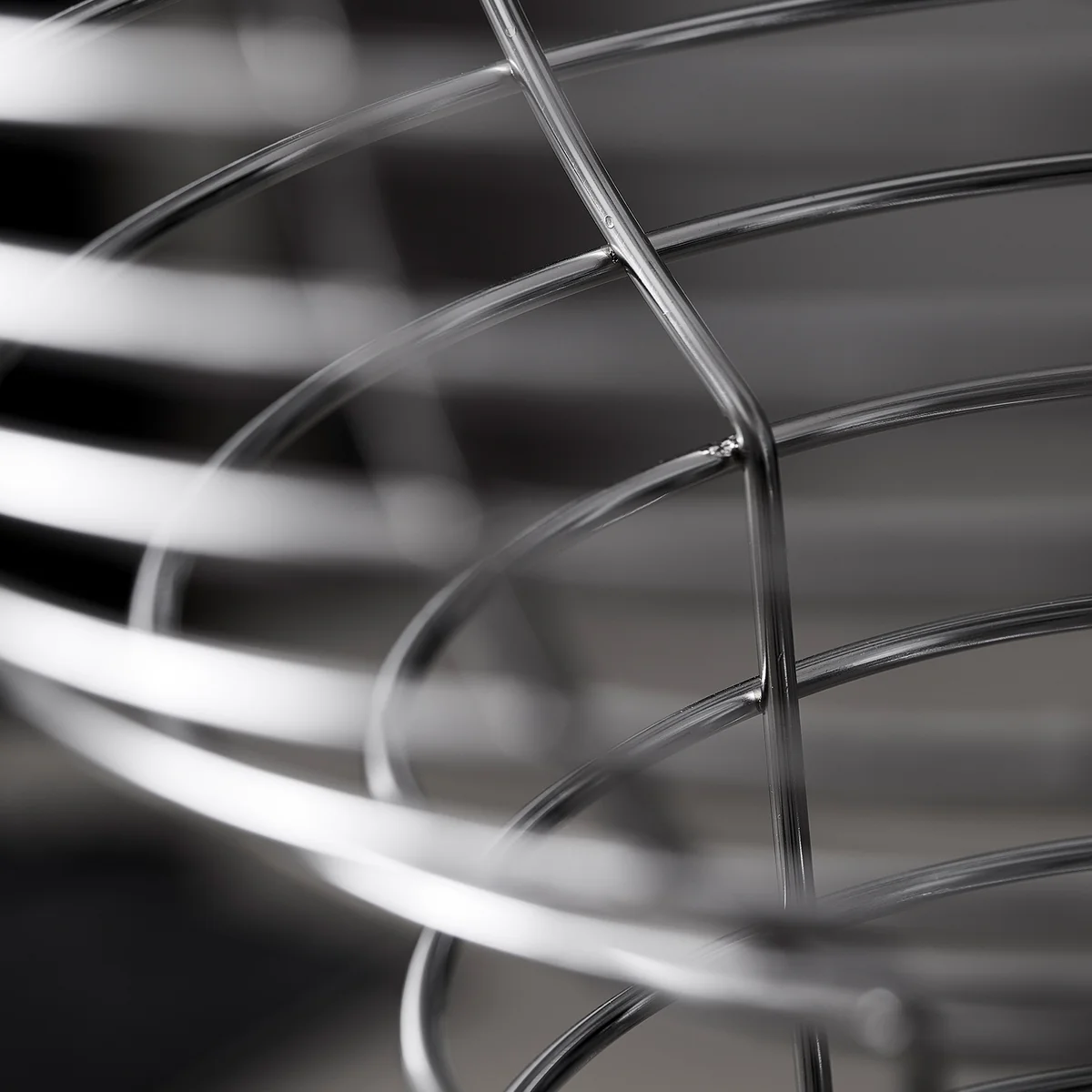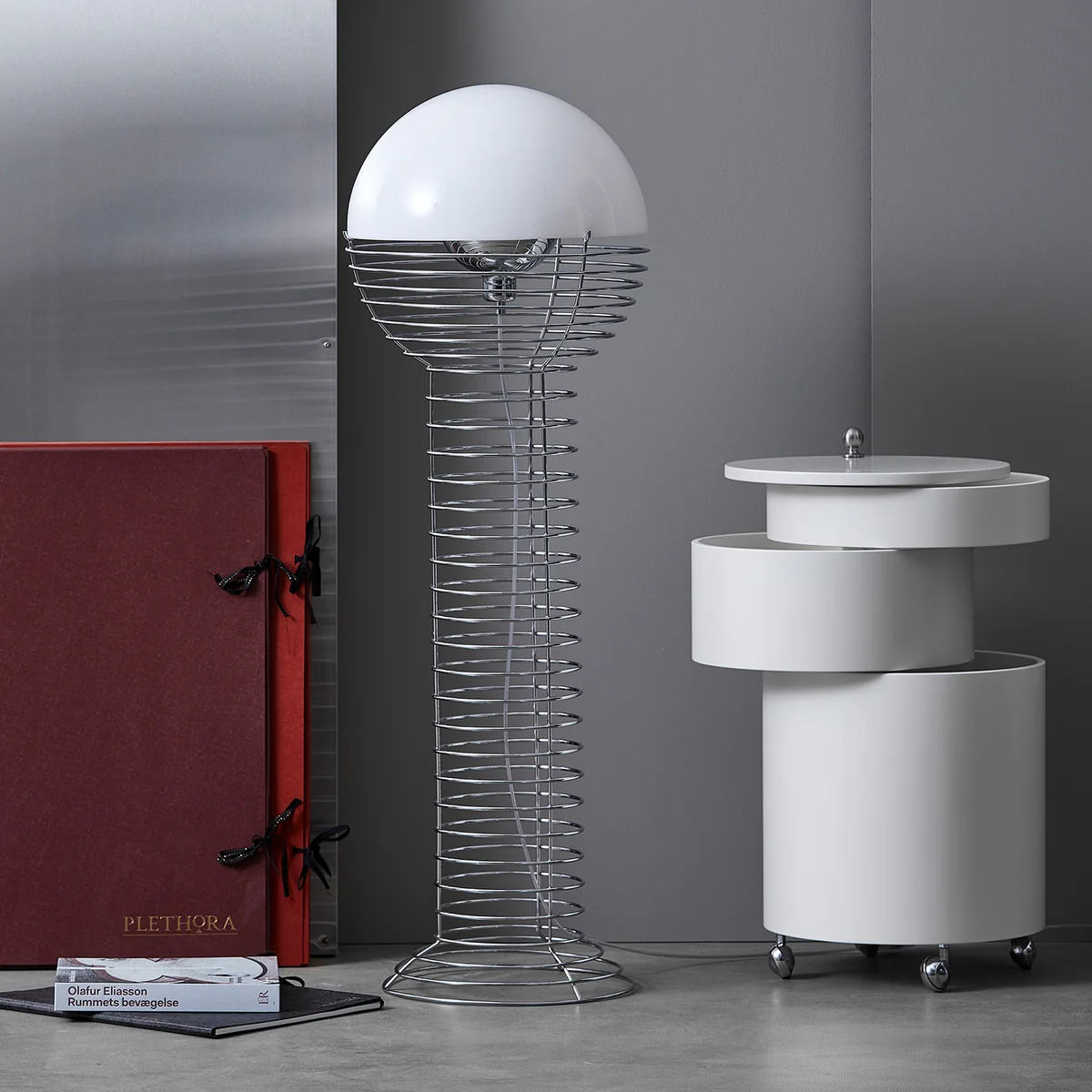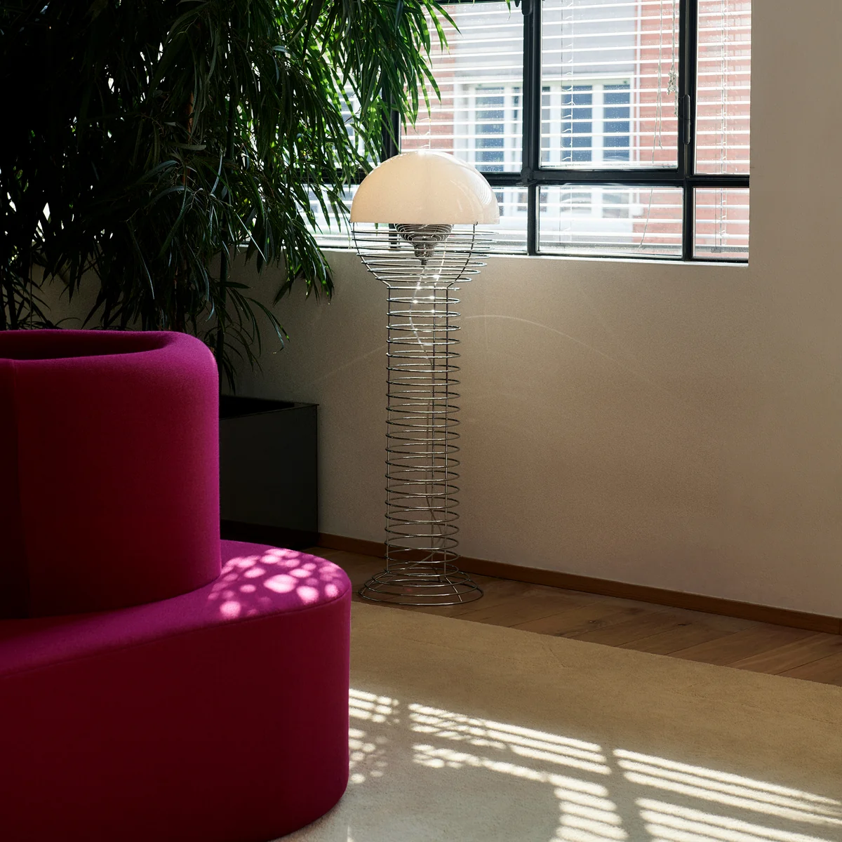 Le modèle Wire lampadaire de Verpan est une création du designer danois Verner Panton datant de 197 2. Le luminaire possède une armature en fil d'acier torsadé qui rappelle un ressort et donne ainsi une impression d'aération et de légèreté. La structure se termine par un abat-jour hémisphérique en plastique sous lequel est dissimulé un réflecteur métallique. Le luminaire émet ainsi une lumière douce et diffuse qui plonge la pièce dans une atmosphère chaleureuse.